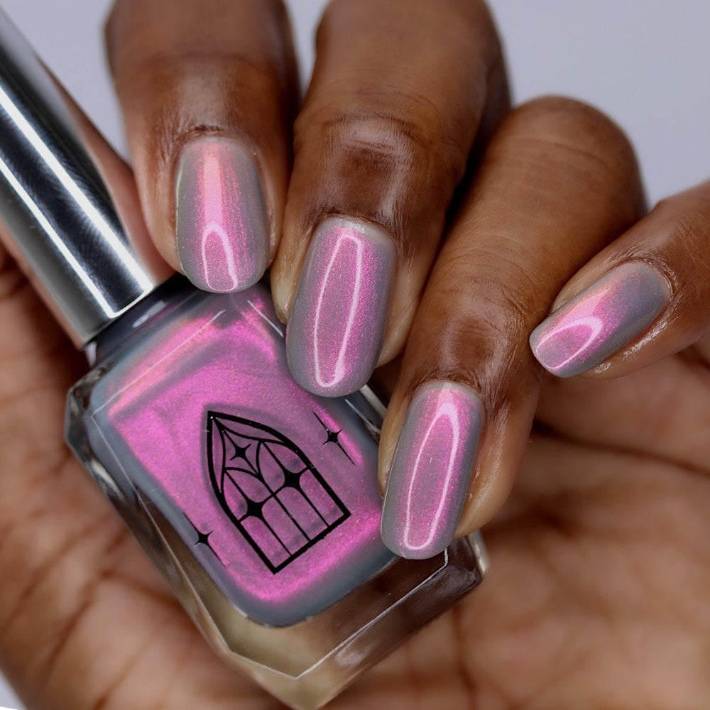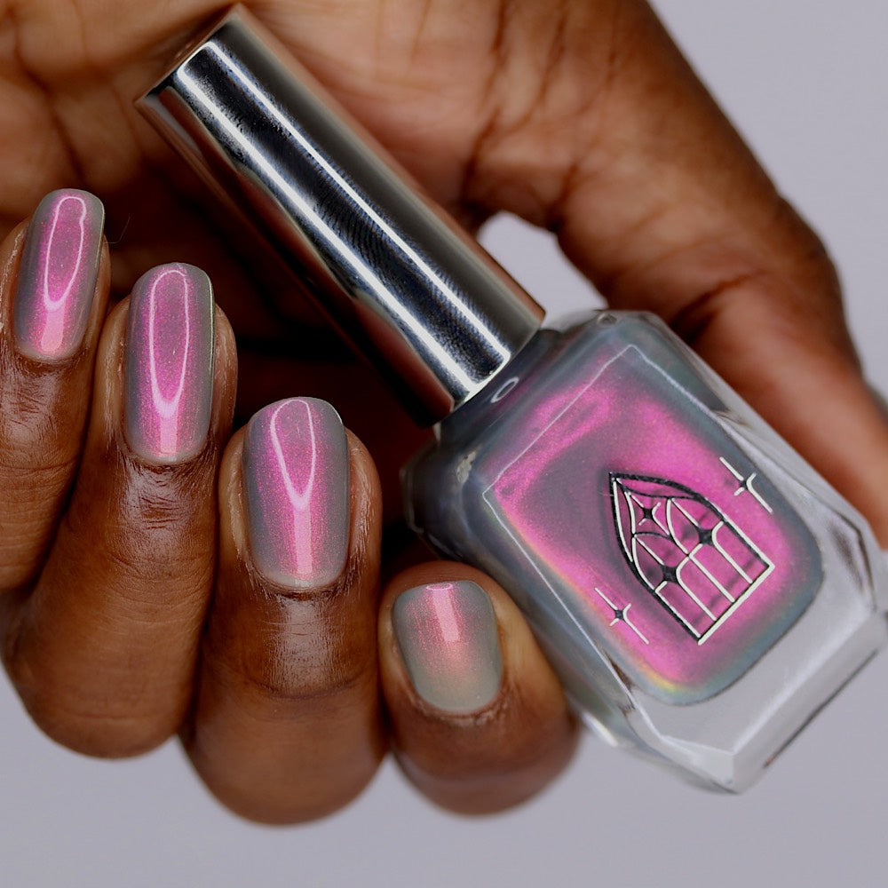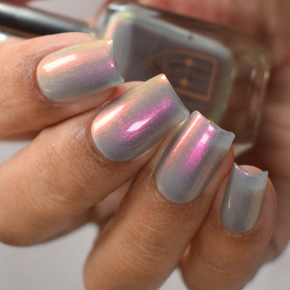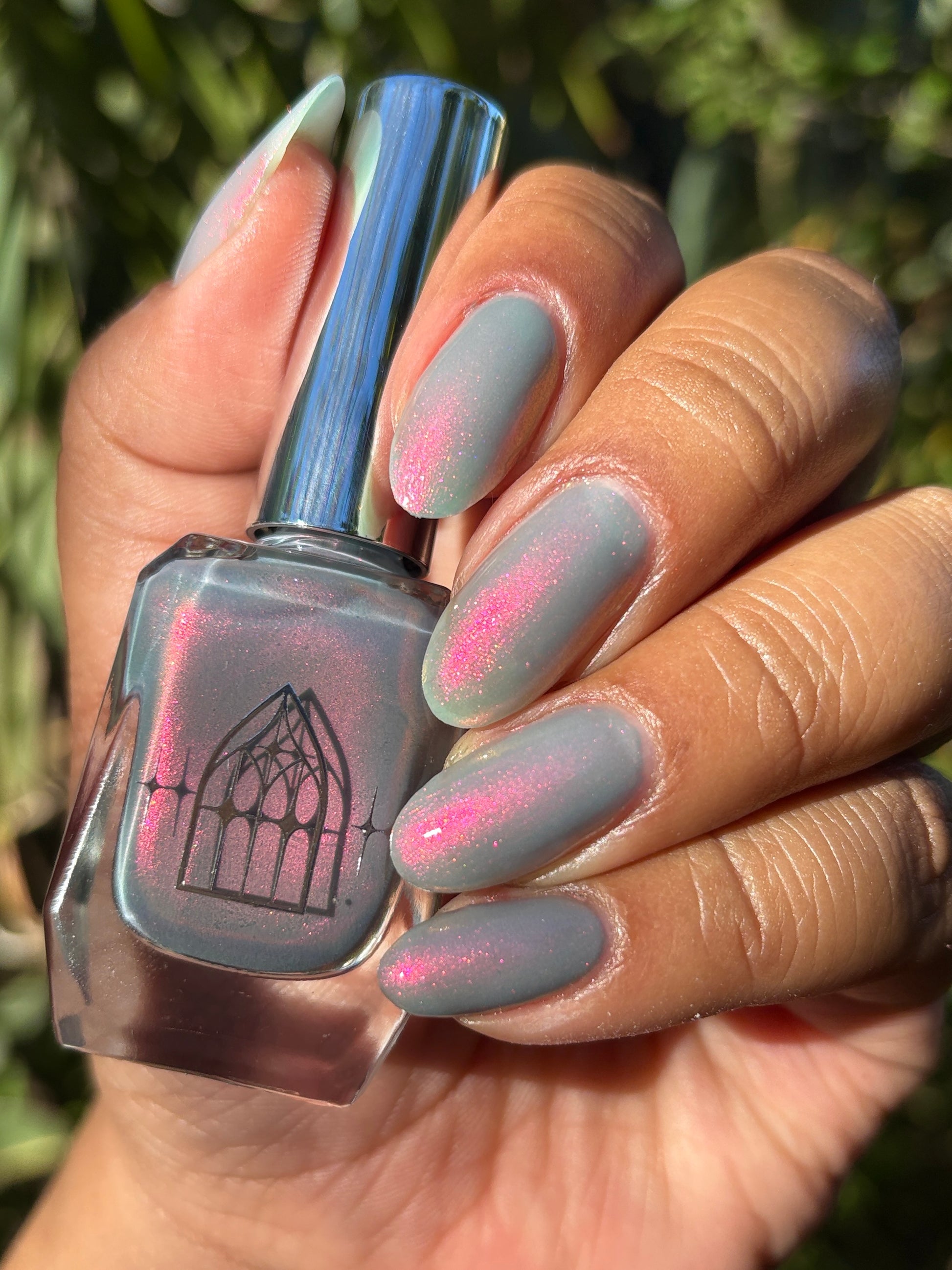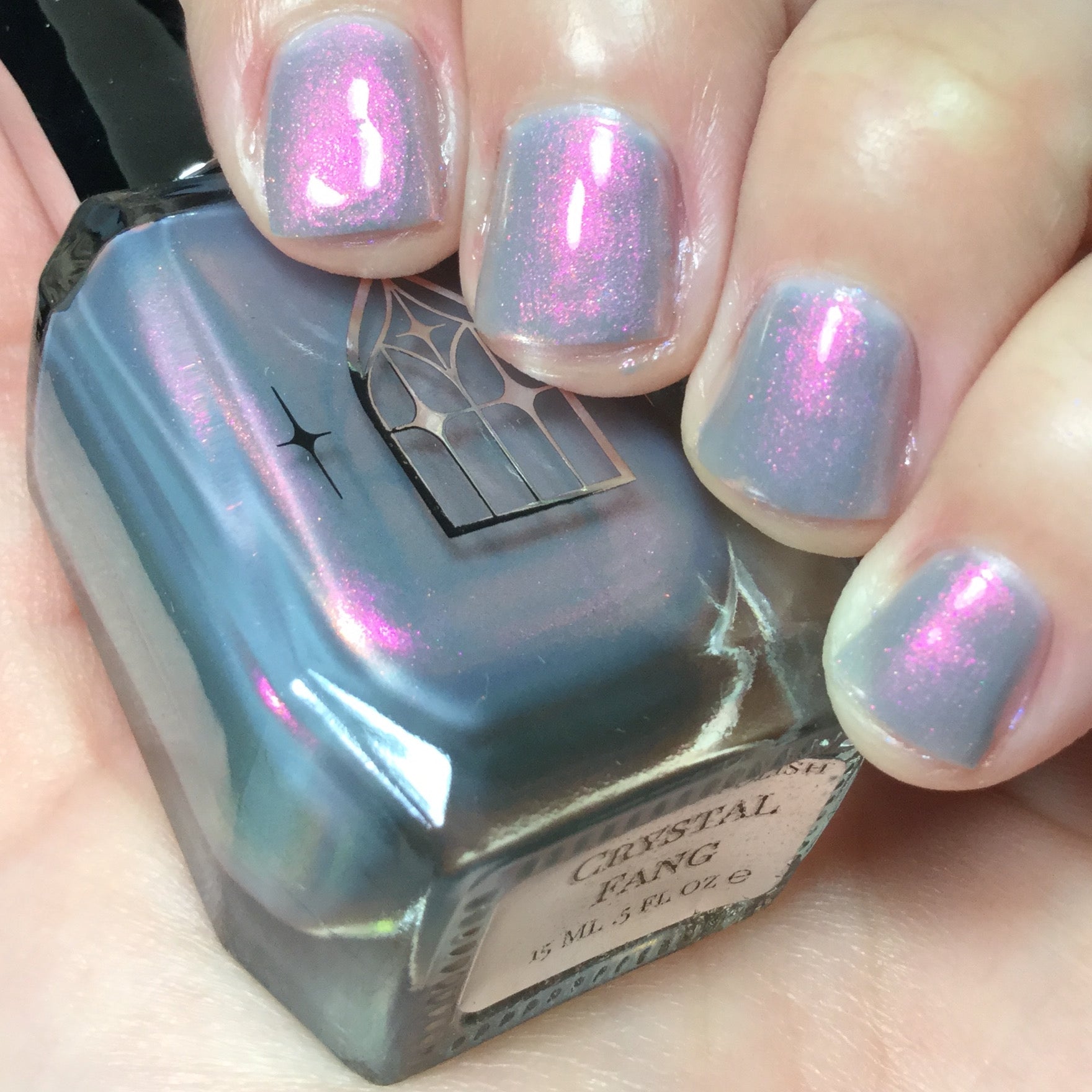 CRYSTAL FANG is a cool blue toned grey sharpened with luminous pink to copper shifting shimmer. Reveal its full crystalline edge in two coats.