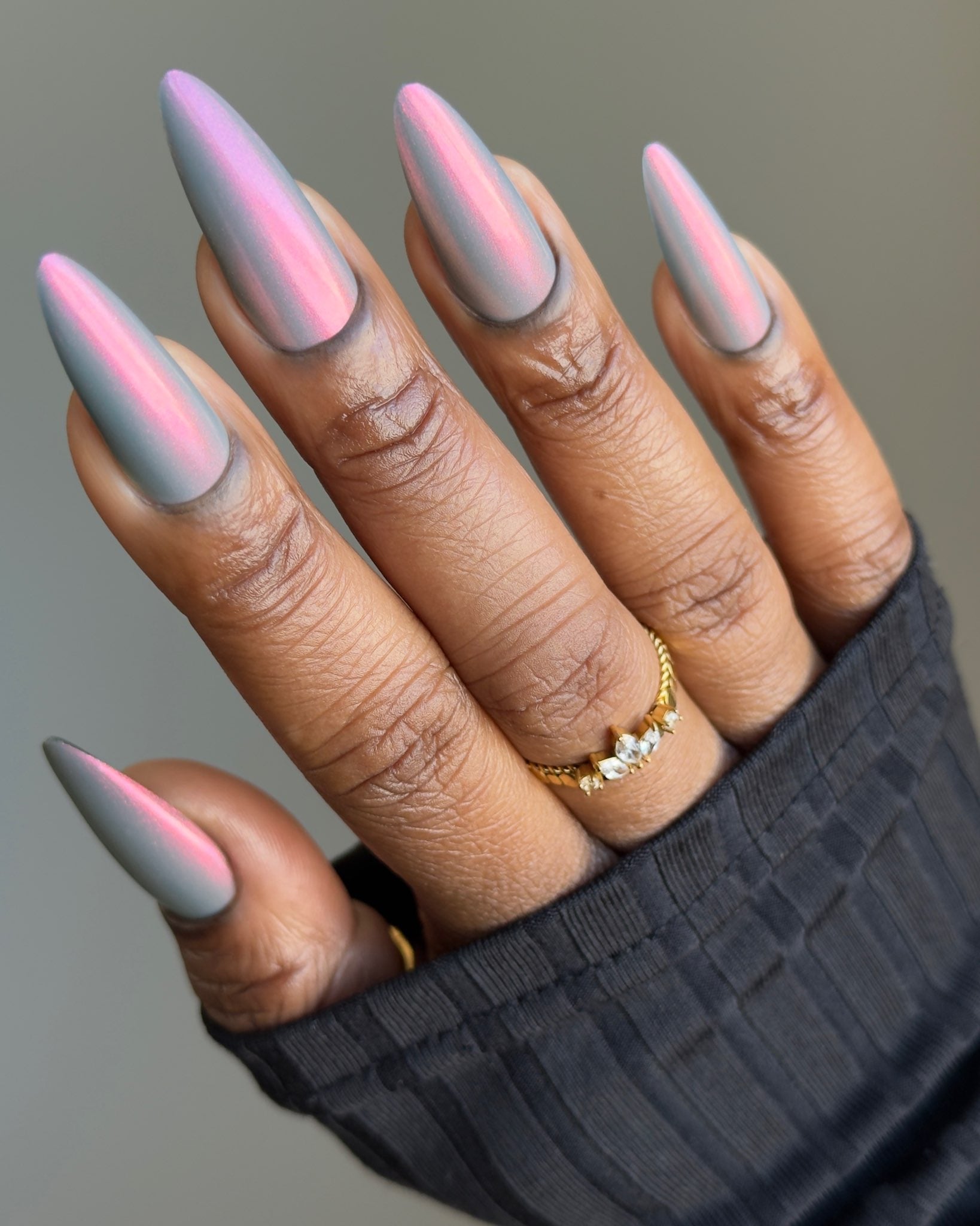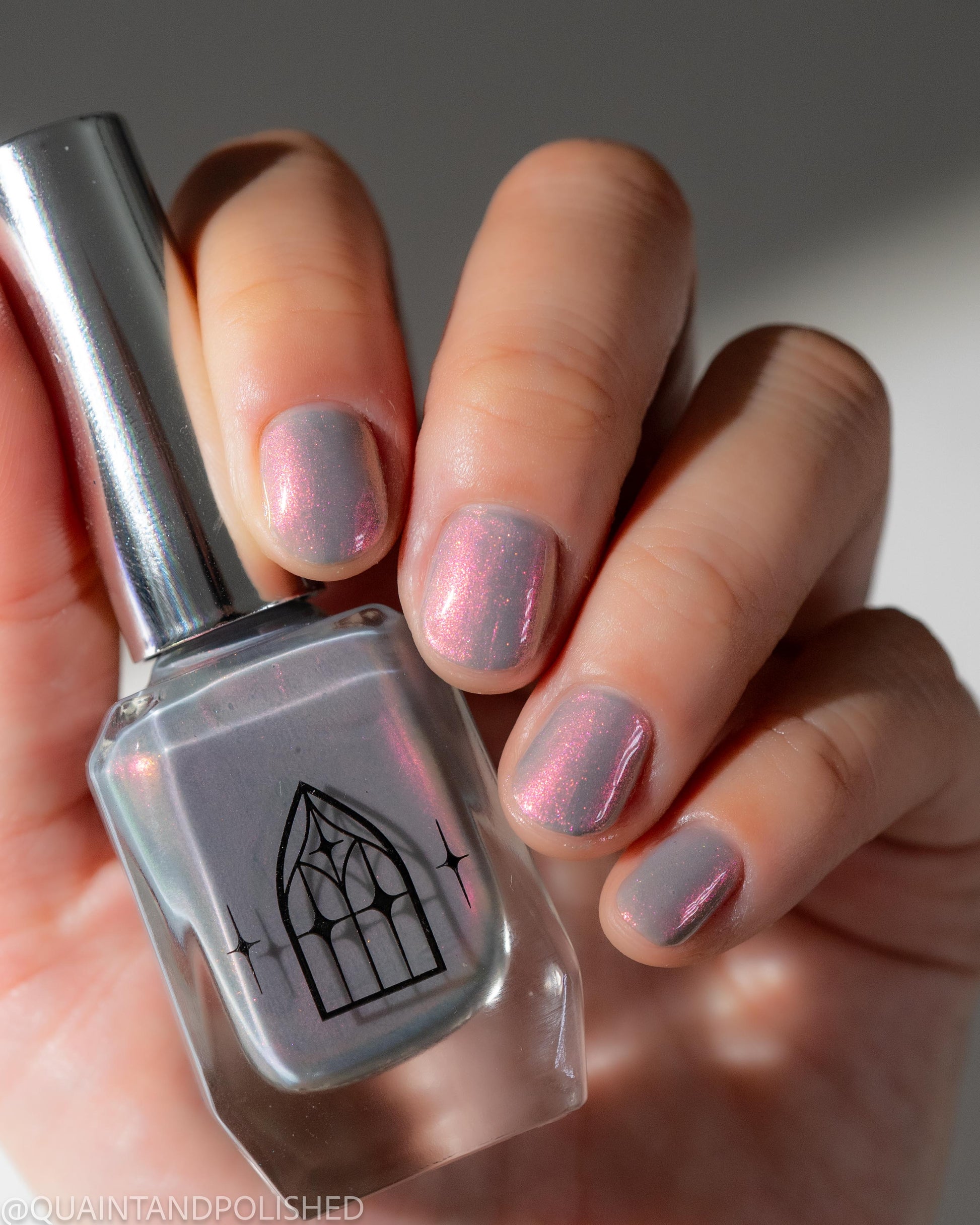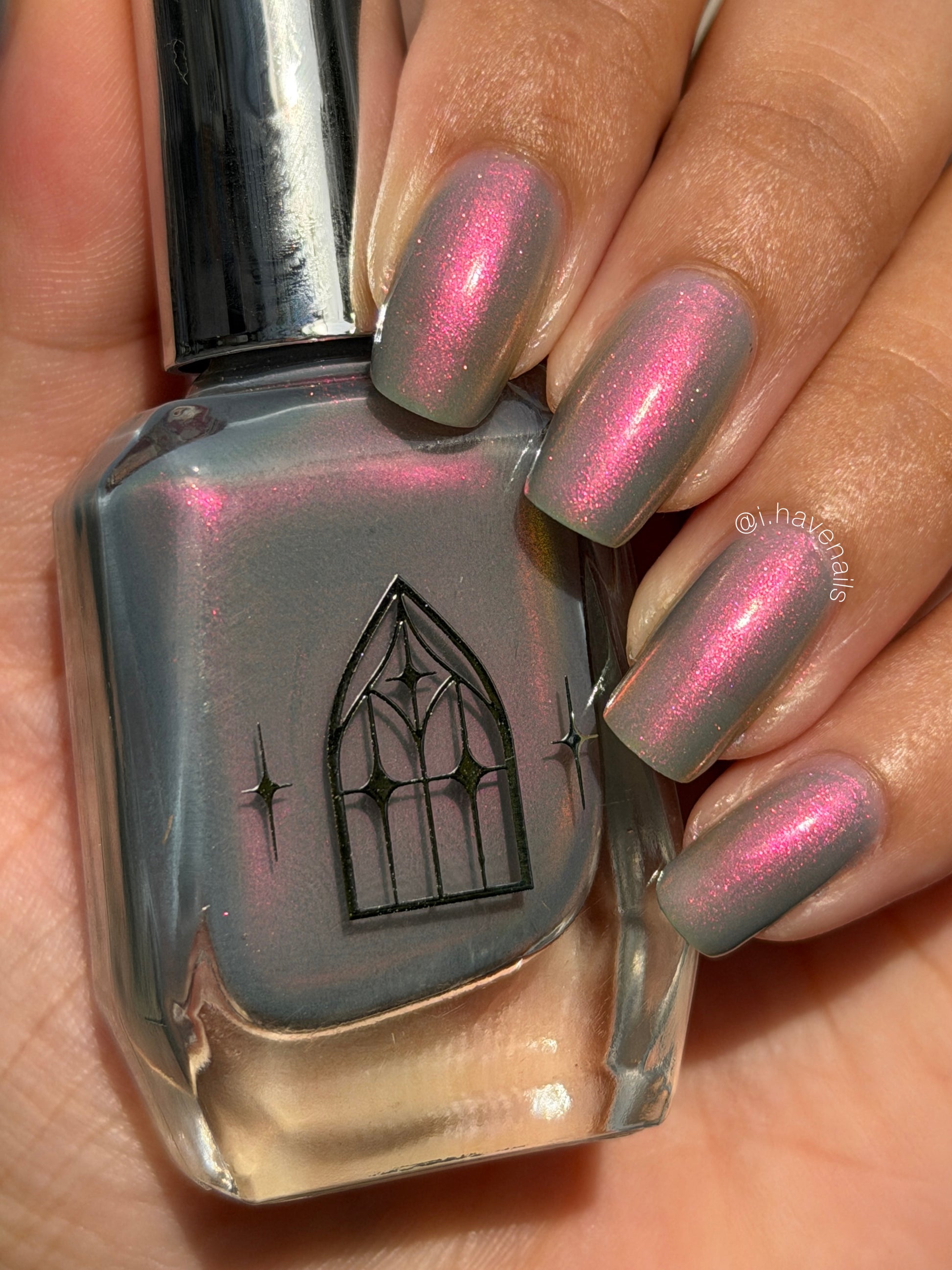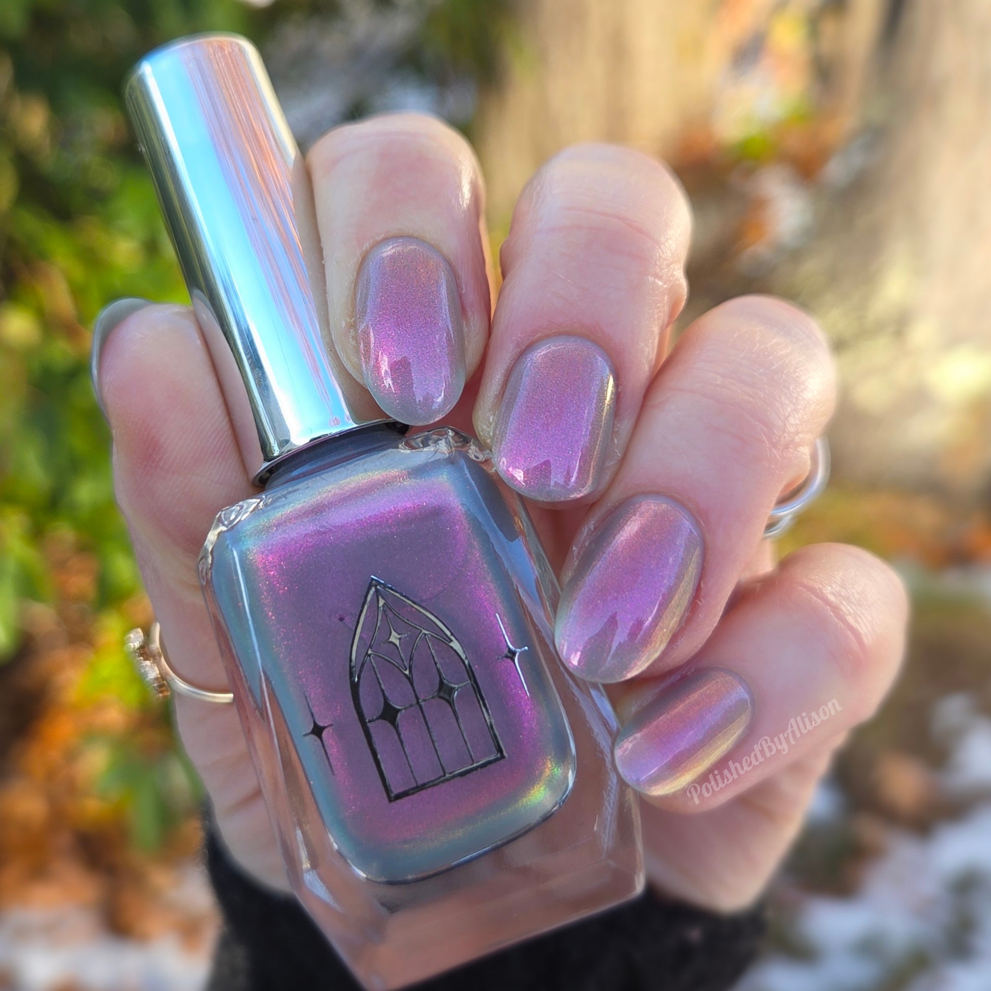 CRYSTAL FANG is a cool blue toned grey sharpened with luminous pink to copper shifting shimmer. Reveal its full crystalline edge in two coats.