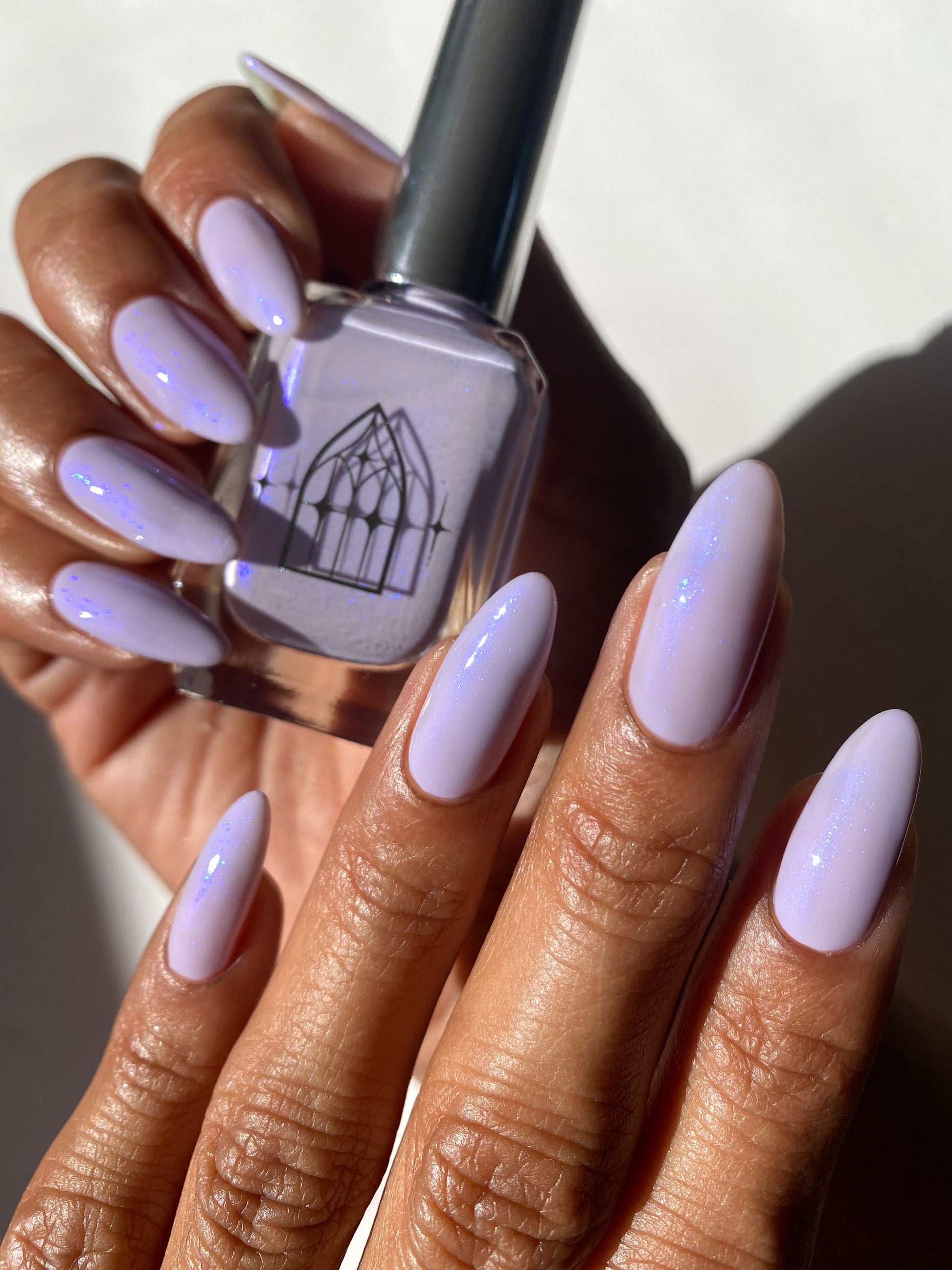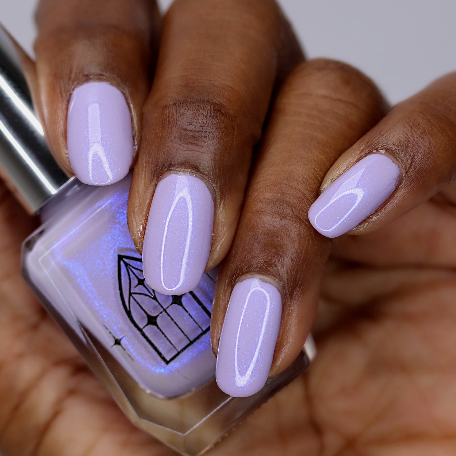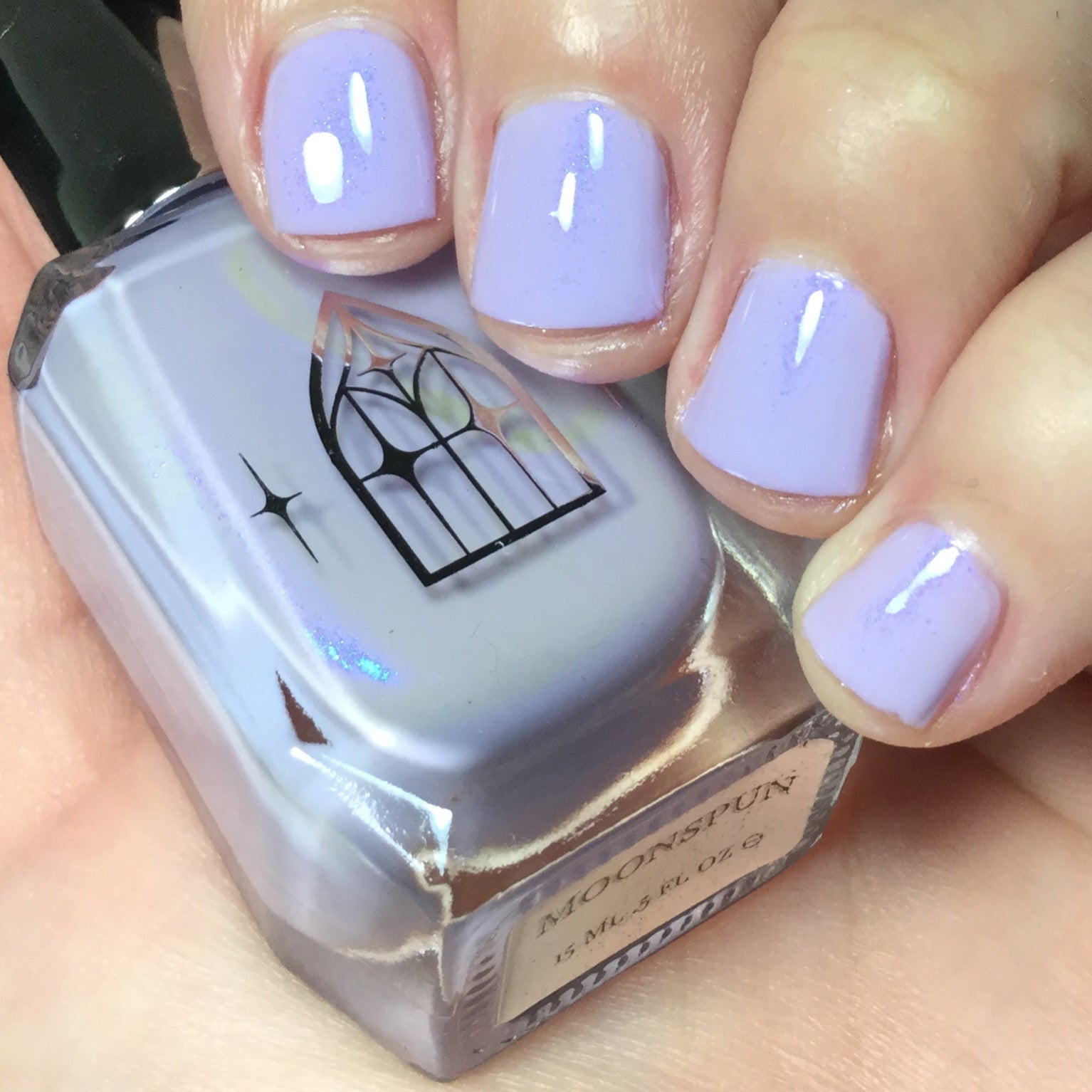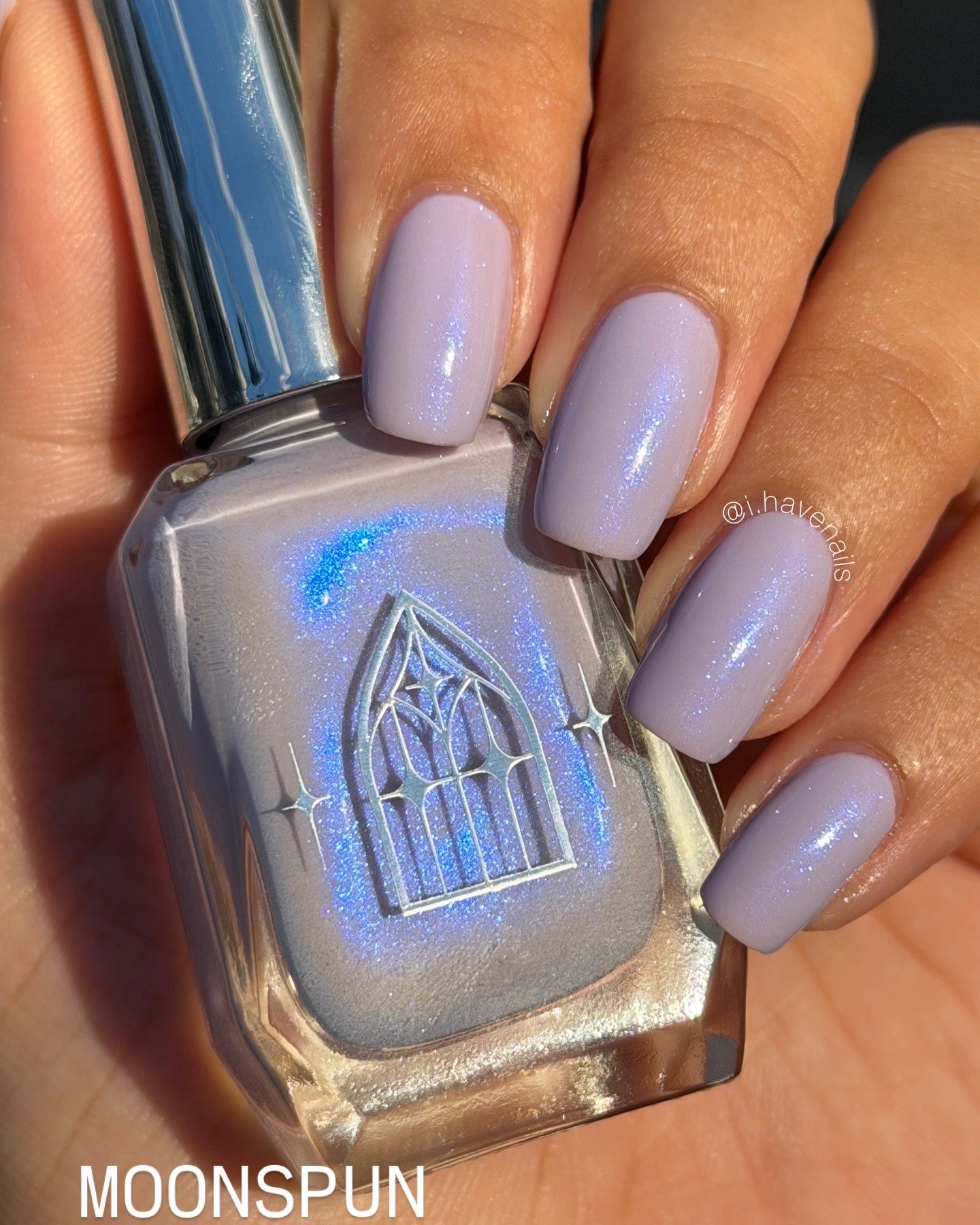 MOONSPUN is a pale lavender with soft ephemeral blue shimmer in a creme formula. Like moonlit spider webs threaded between lush flowers. Apply two to three coats to unleash its full lunar magic.