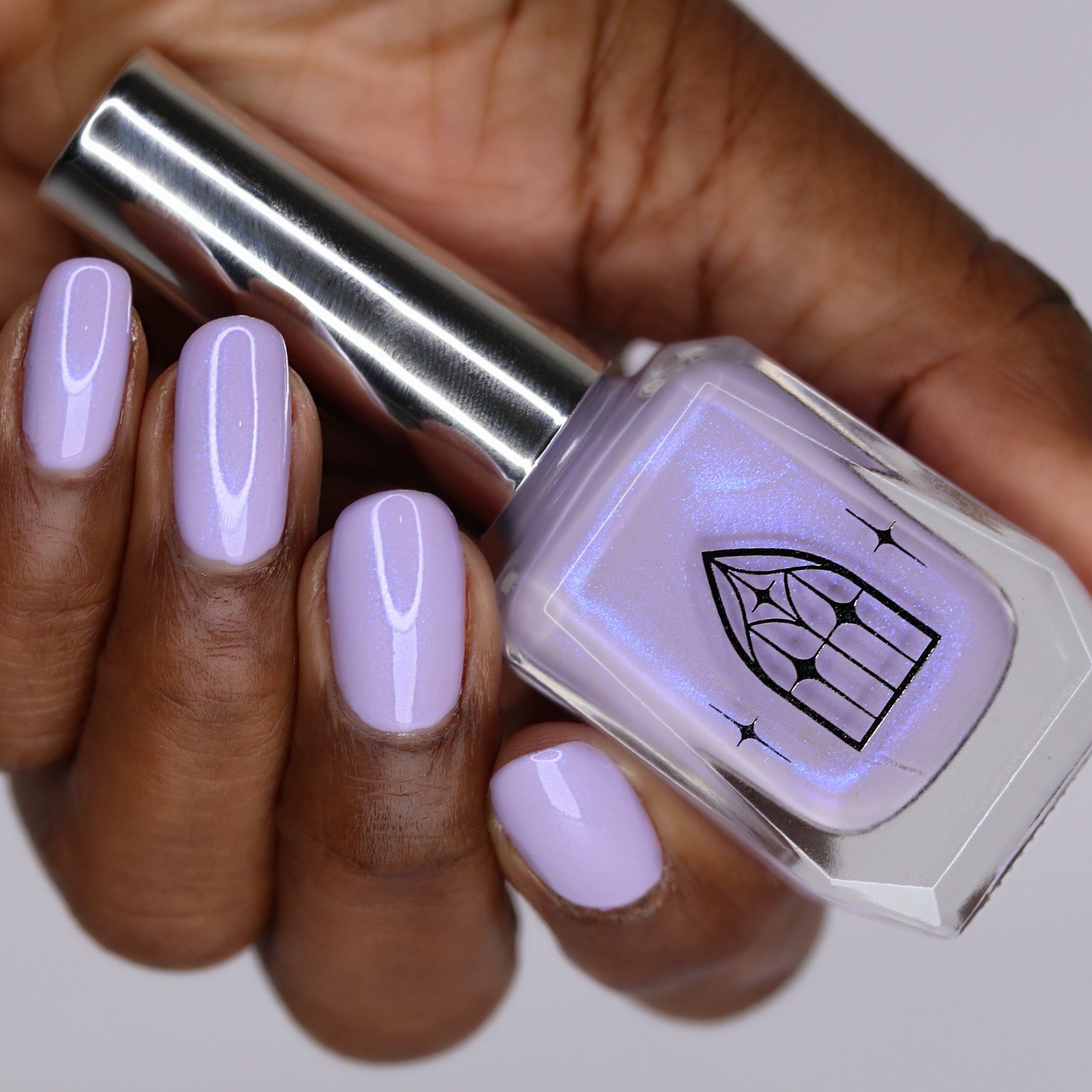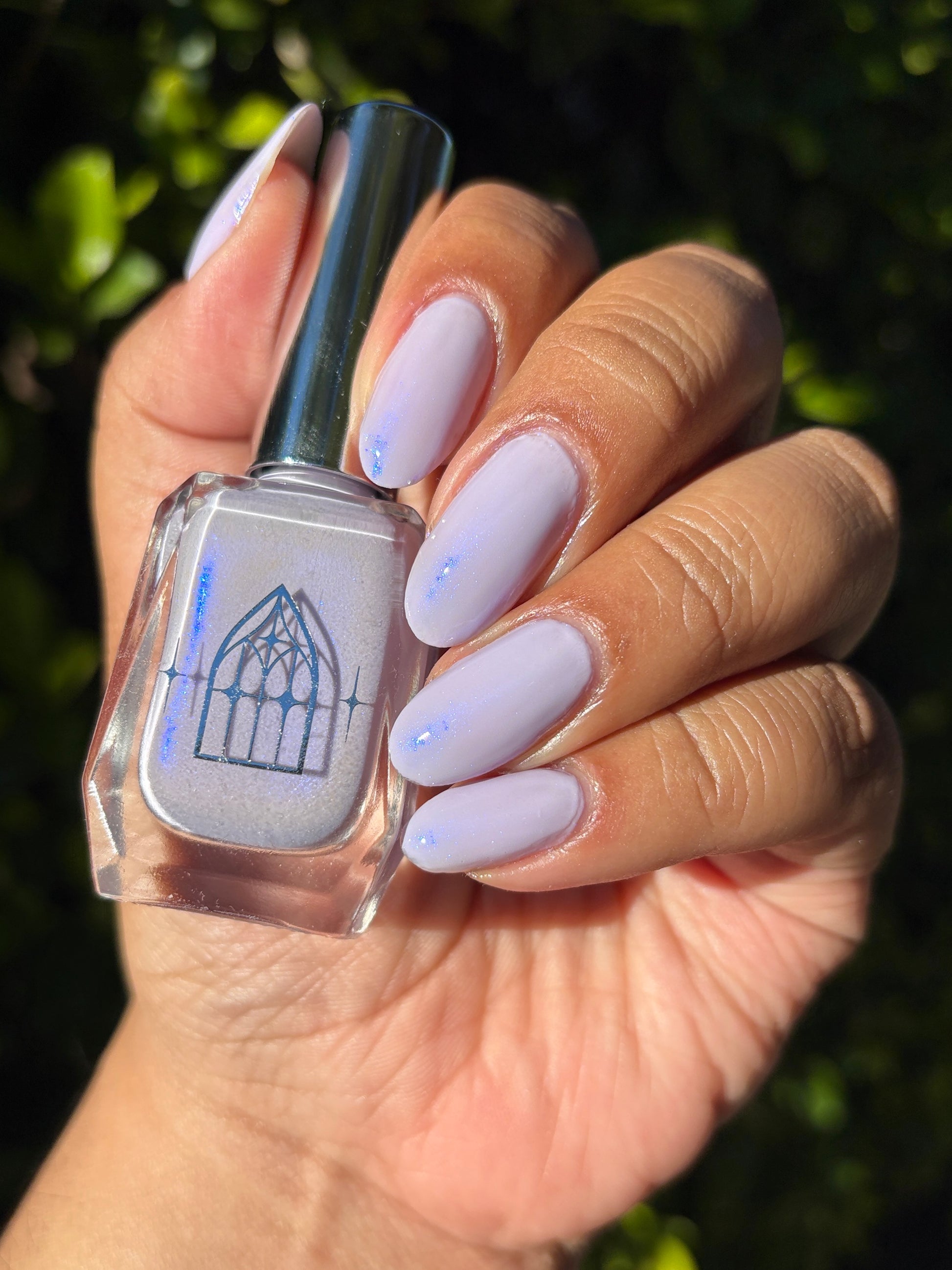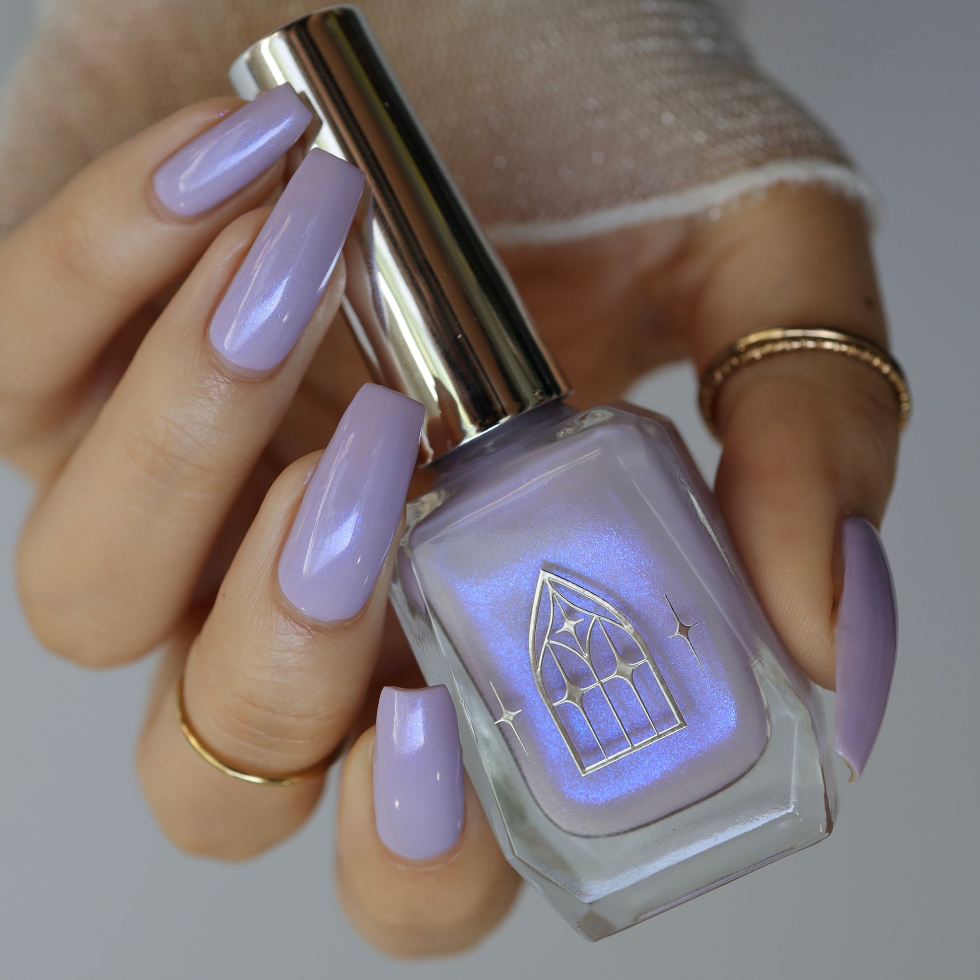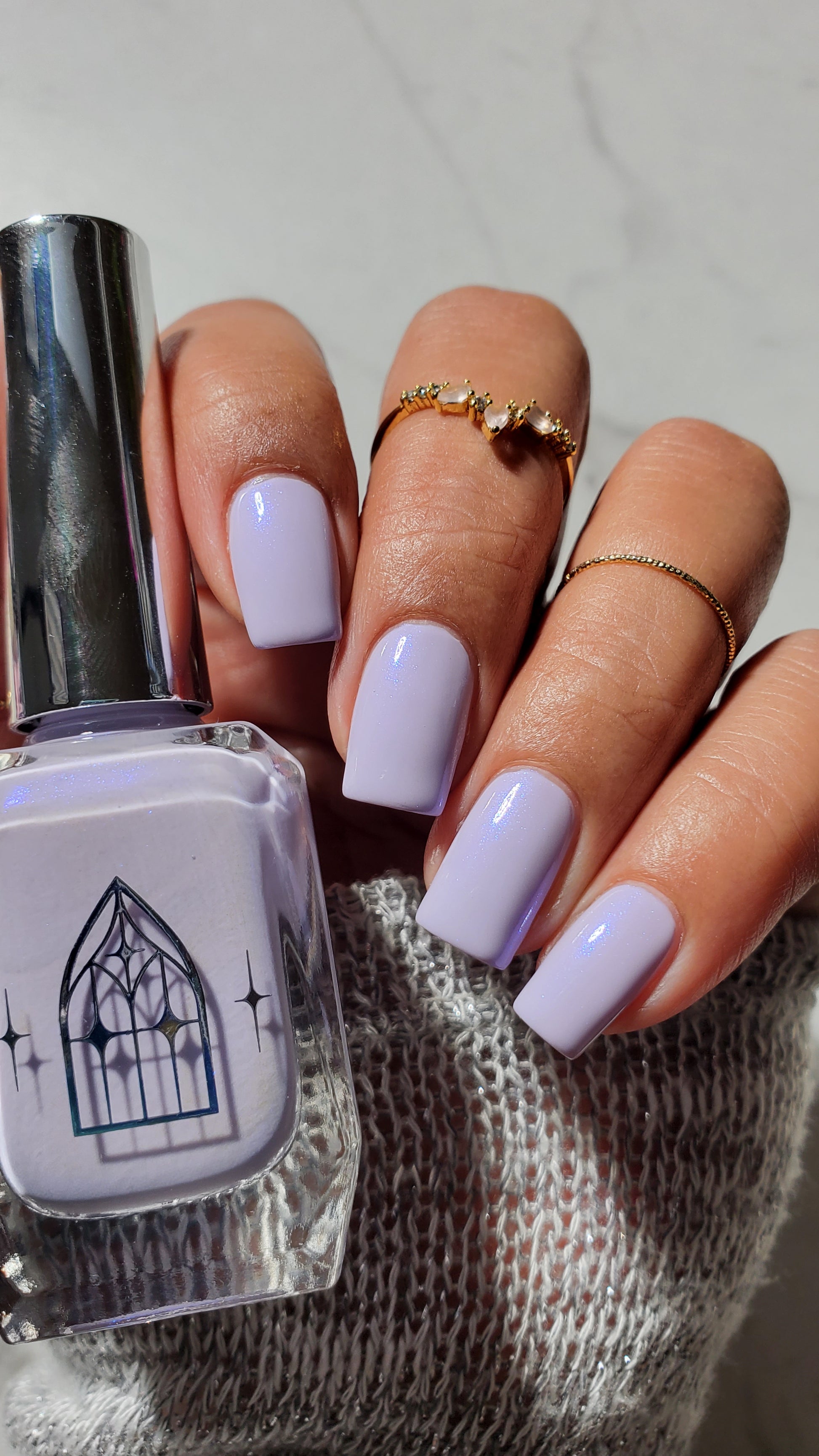 MOONSPUN is a pale lavender with soft ephemeral blue shimmer in a creme formula. Like moonlit spider webs threaded between lush flowers. Apply two to three coats to unleash its full lunar magic.