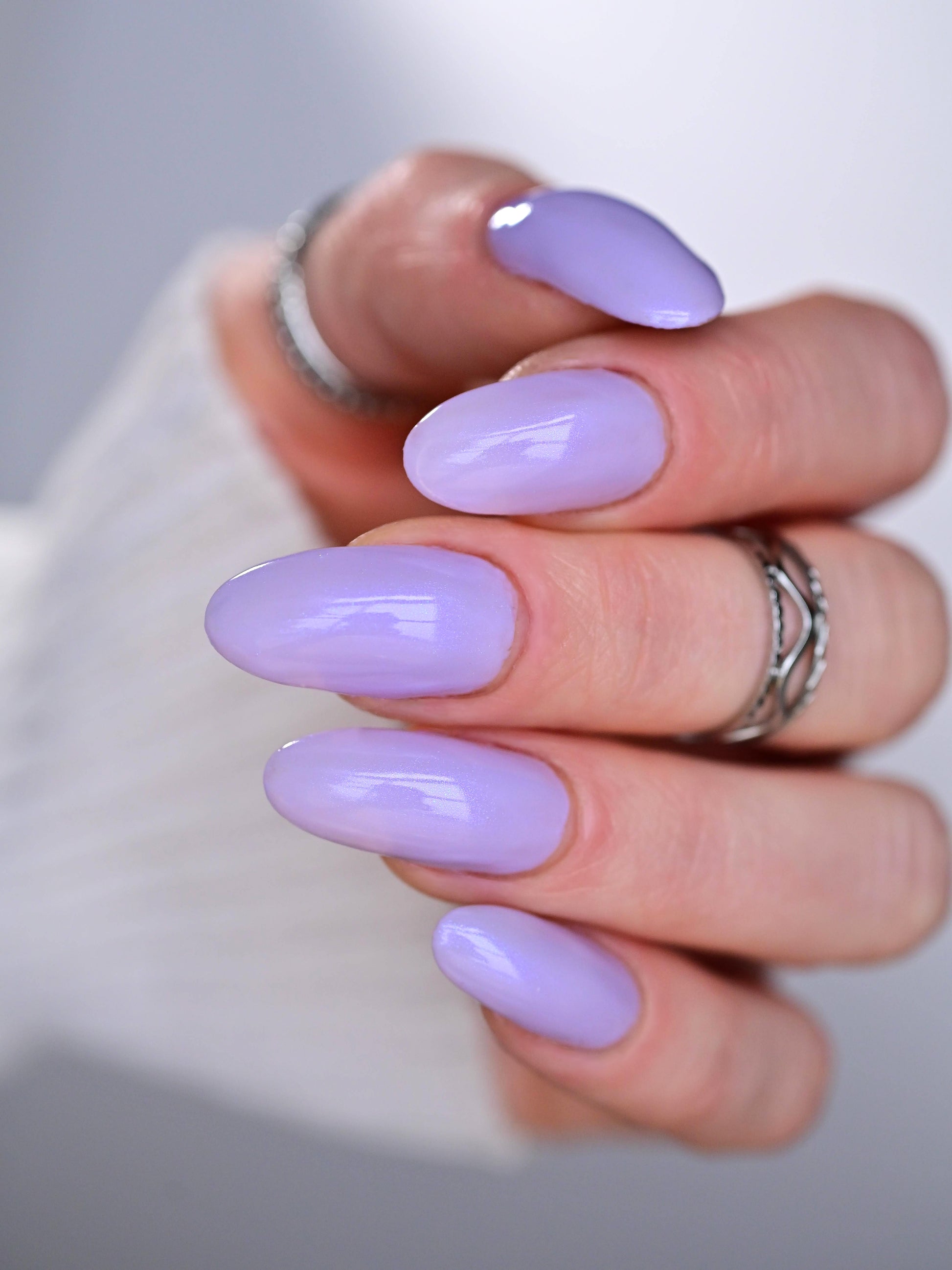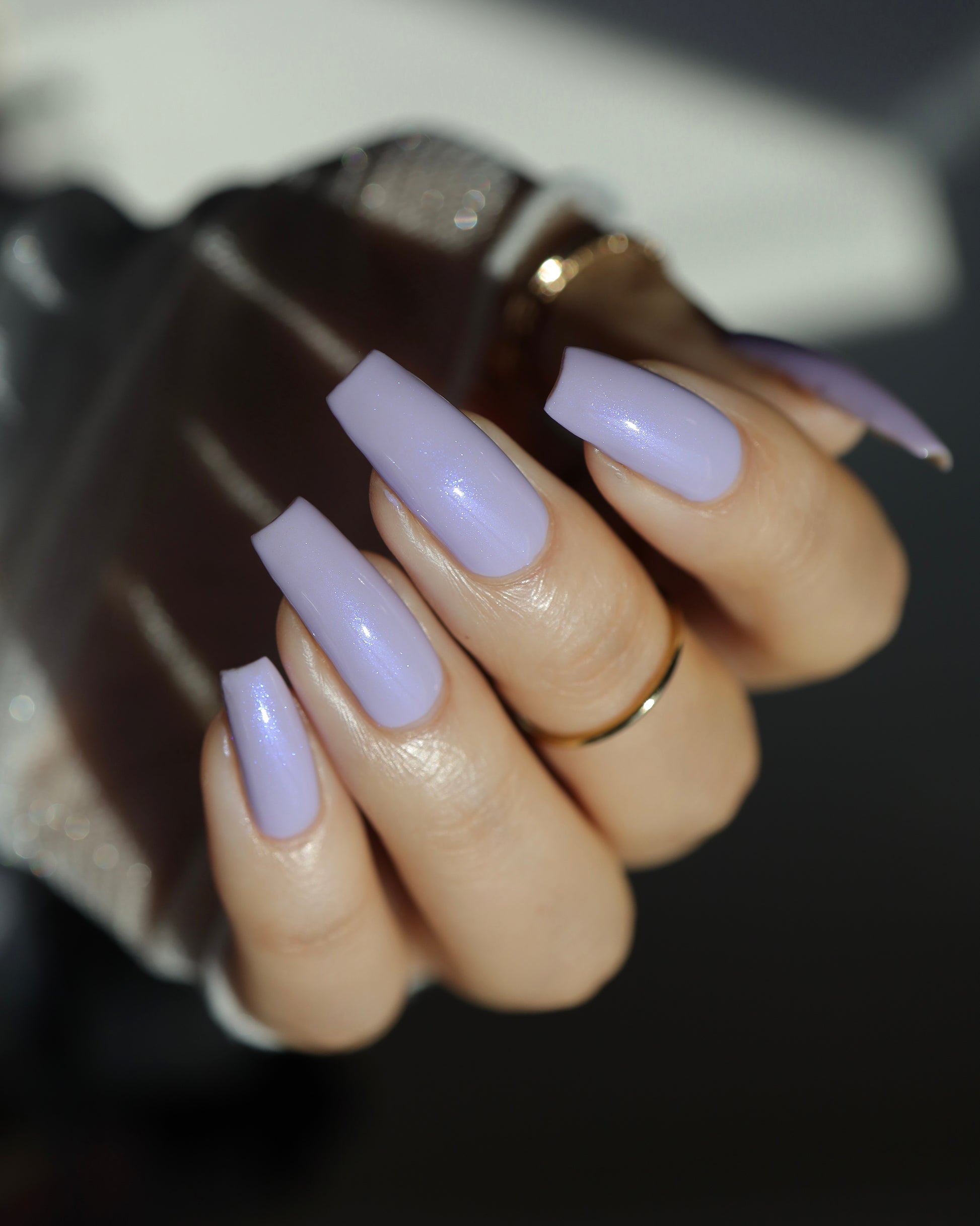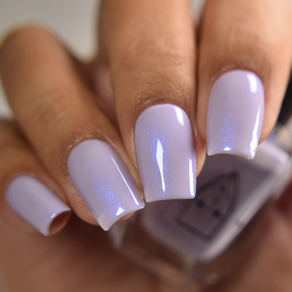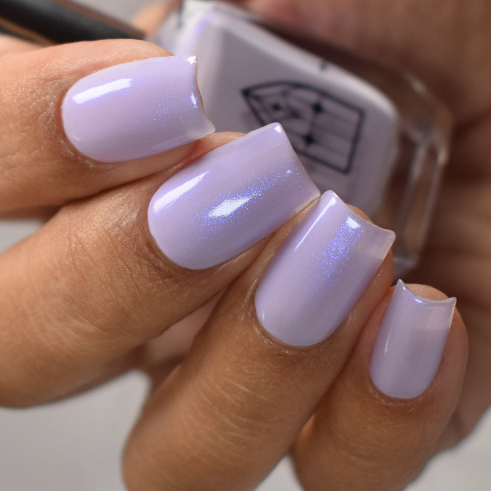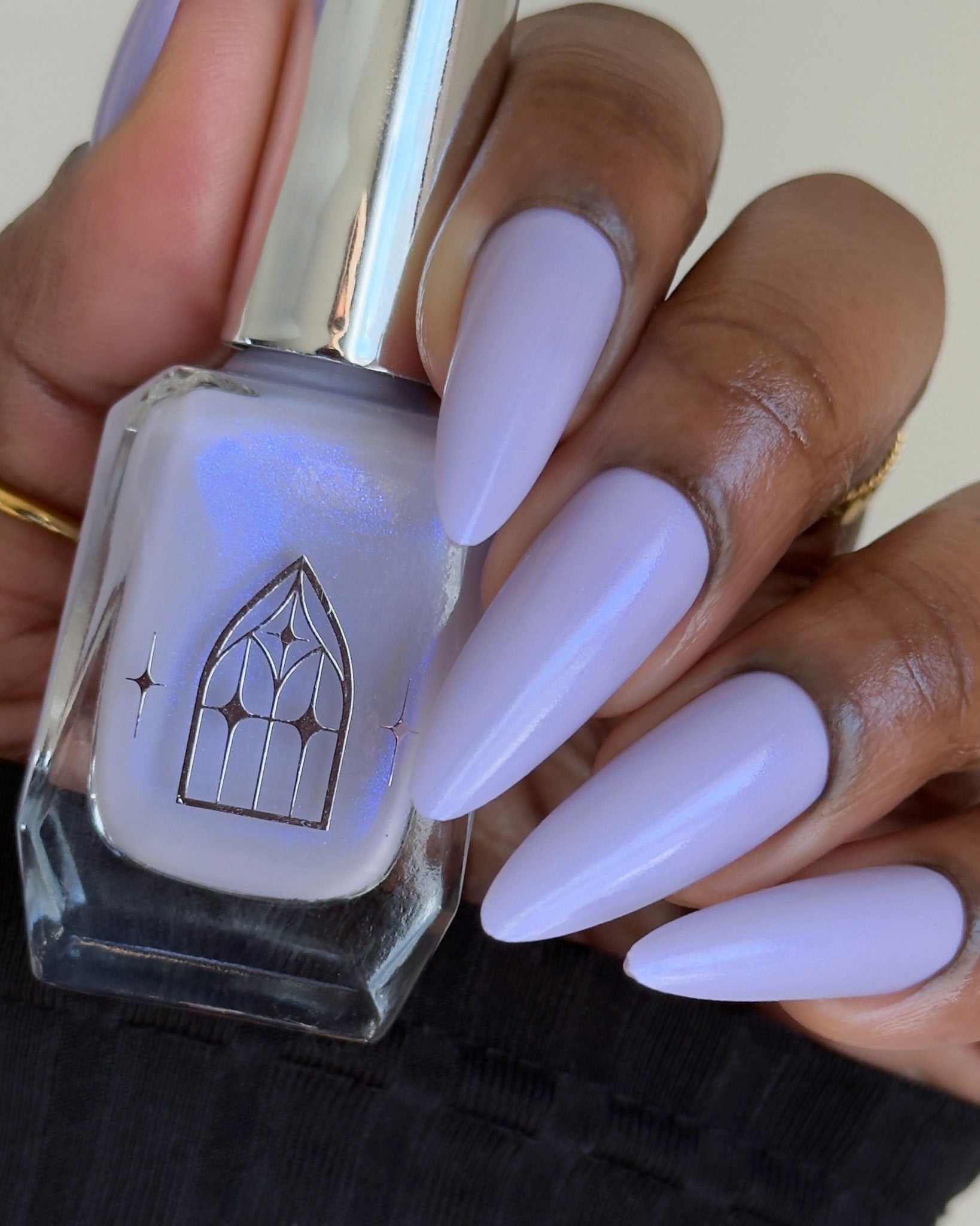 MOONSPUN is a pale lavender with soft ephemeral blue shimmer in a creme formula. Like moonlit spider webs threaded between lush flowers. Apply two to three coats to unleash its full lunar magic.