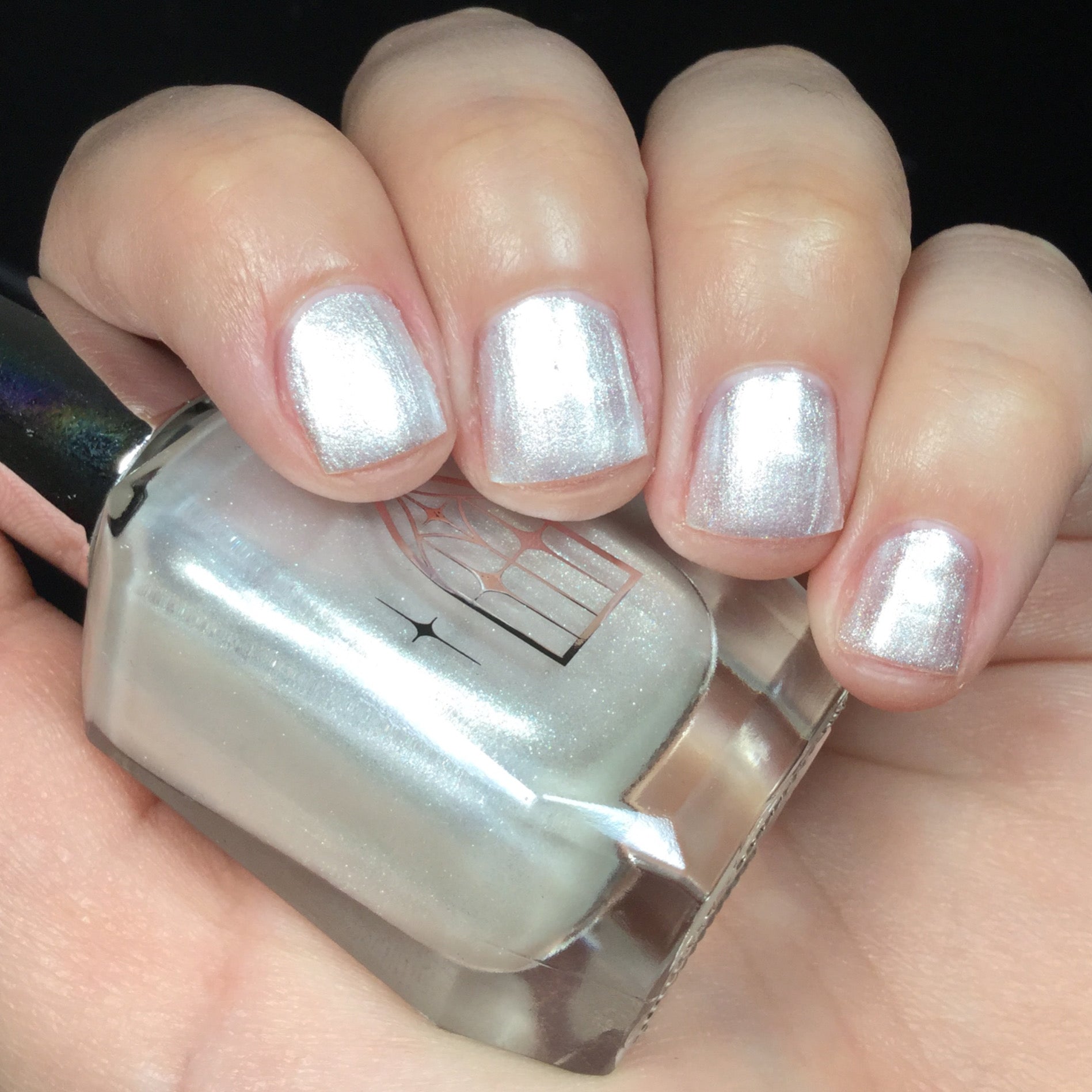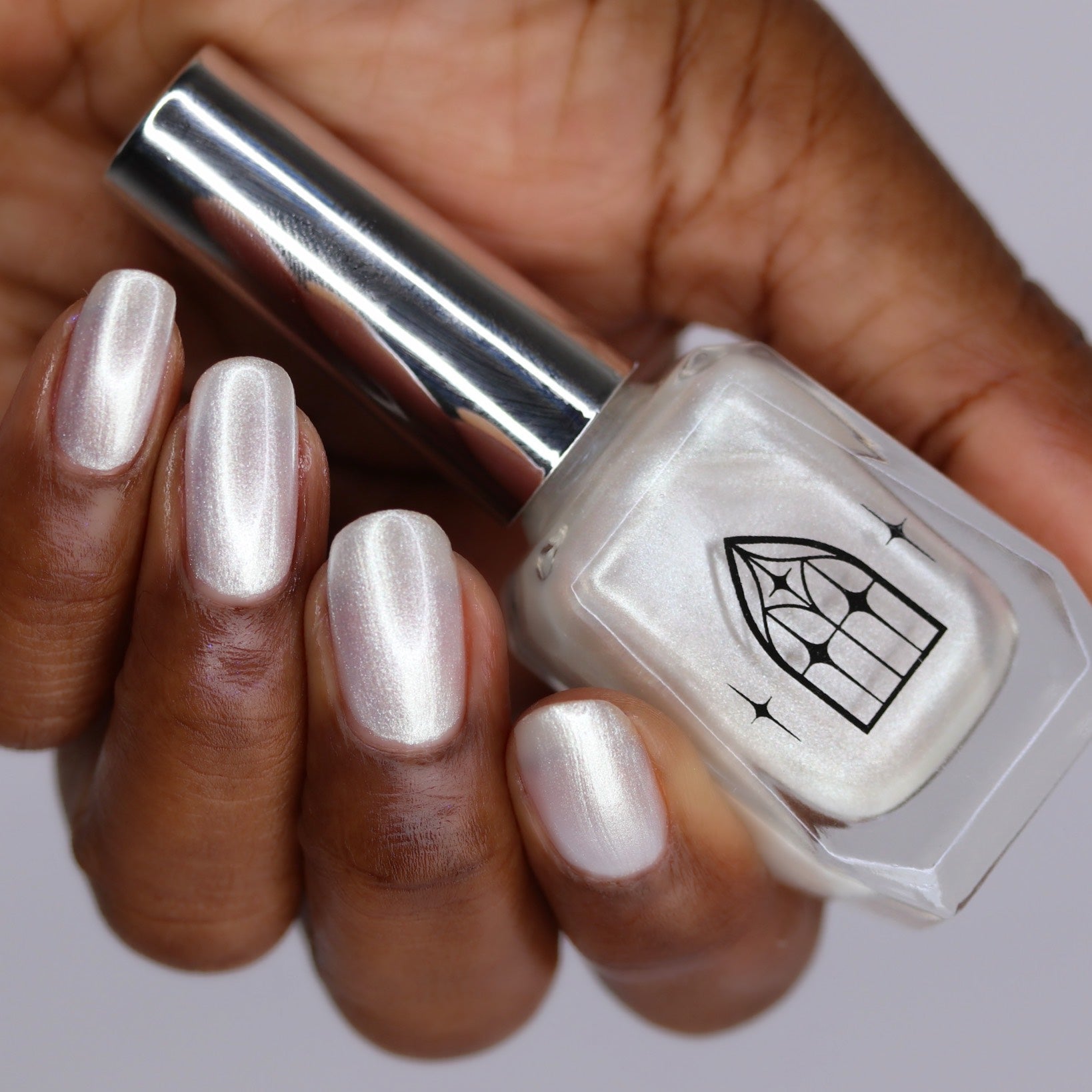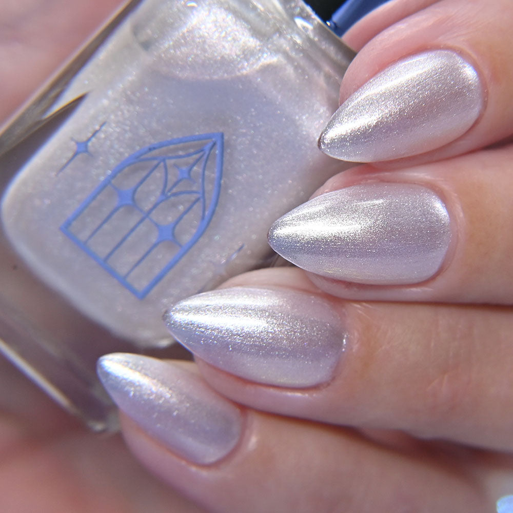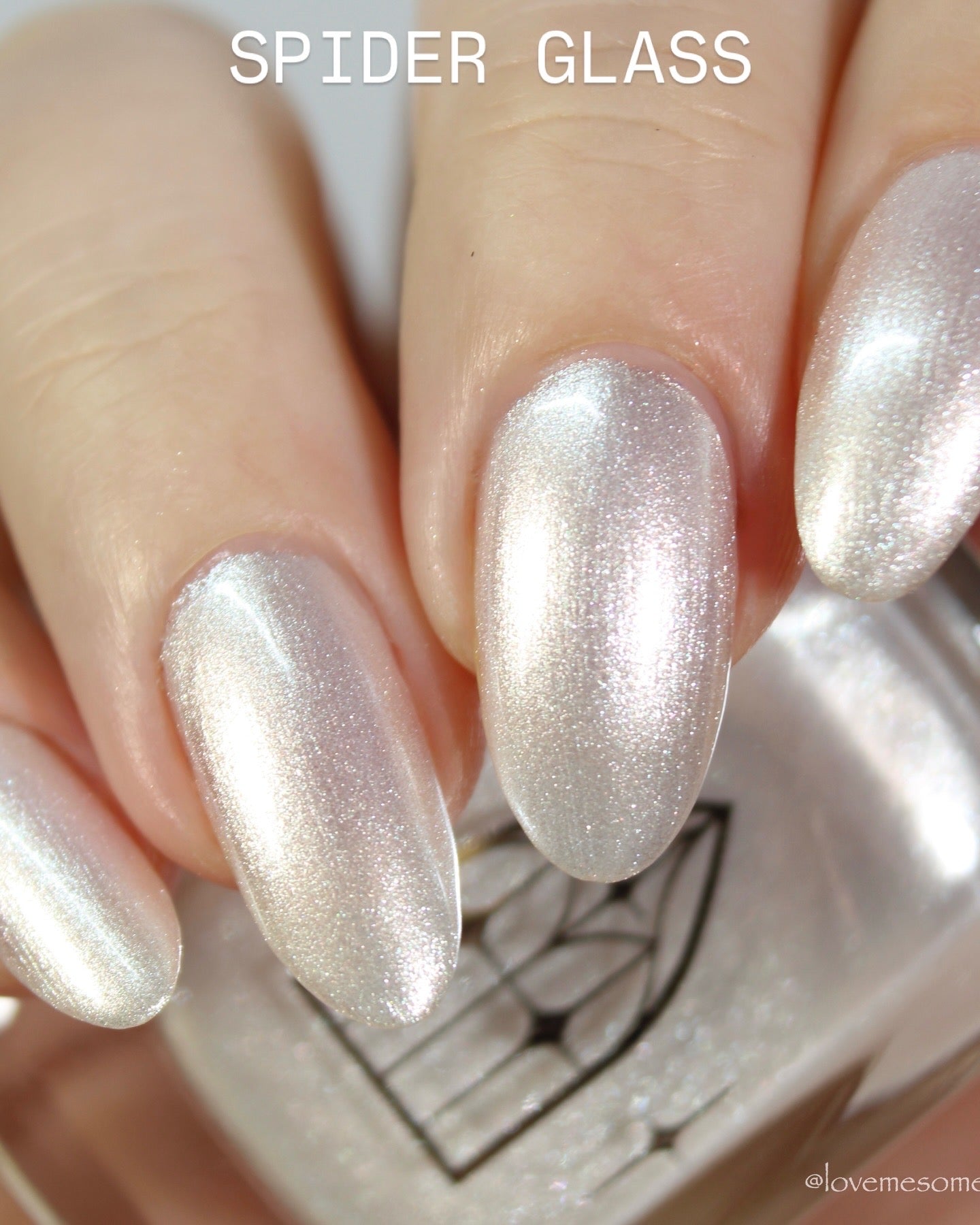 SPIDER GLASS is a white pearlescent with a frosty formula. Delicately luminous like ethereal spider webs. It's gossamer gleam revealed in two to three coats.