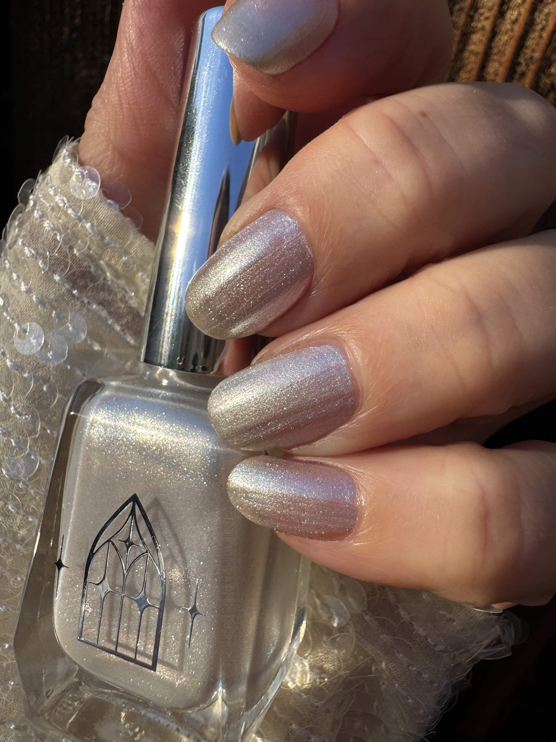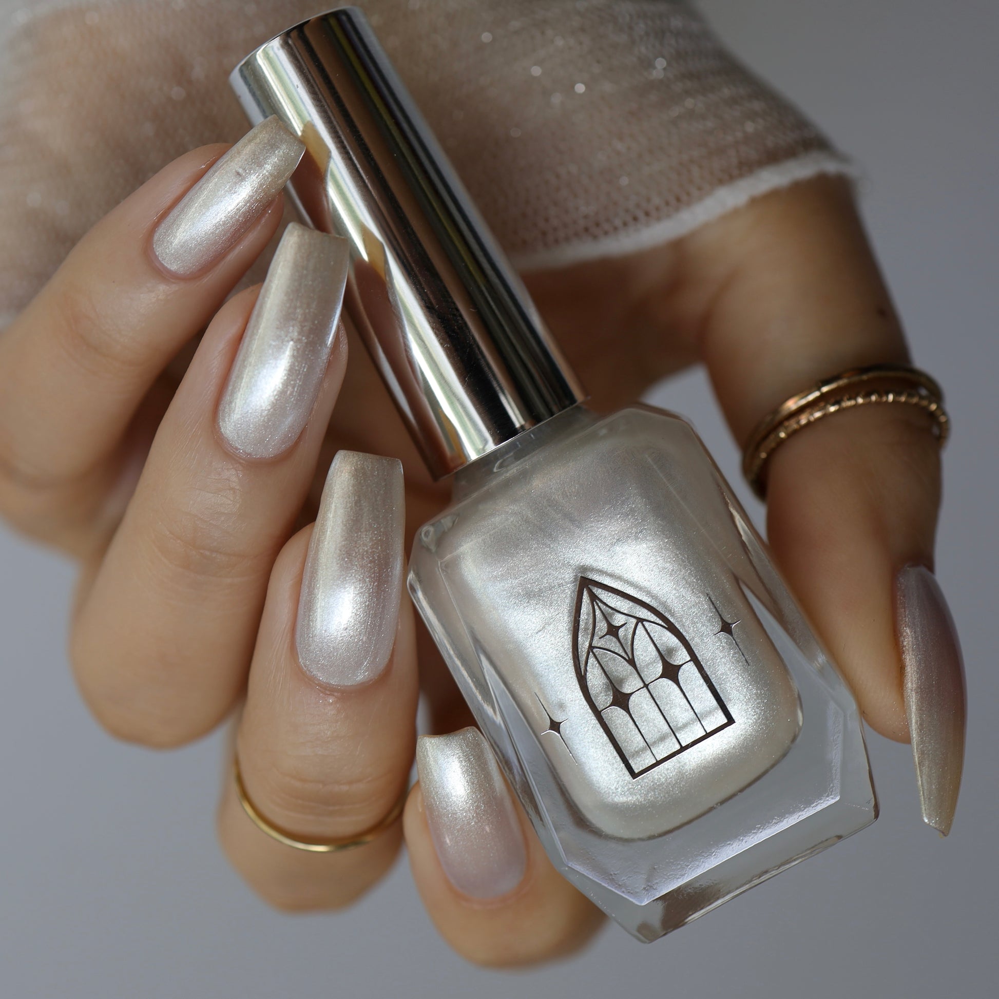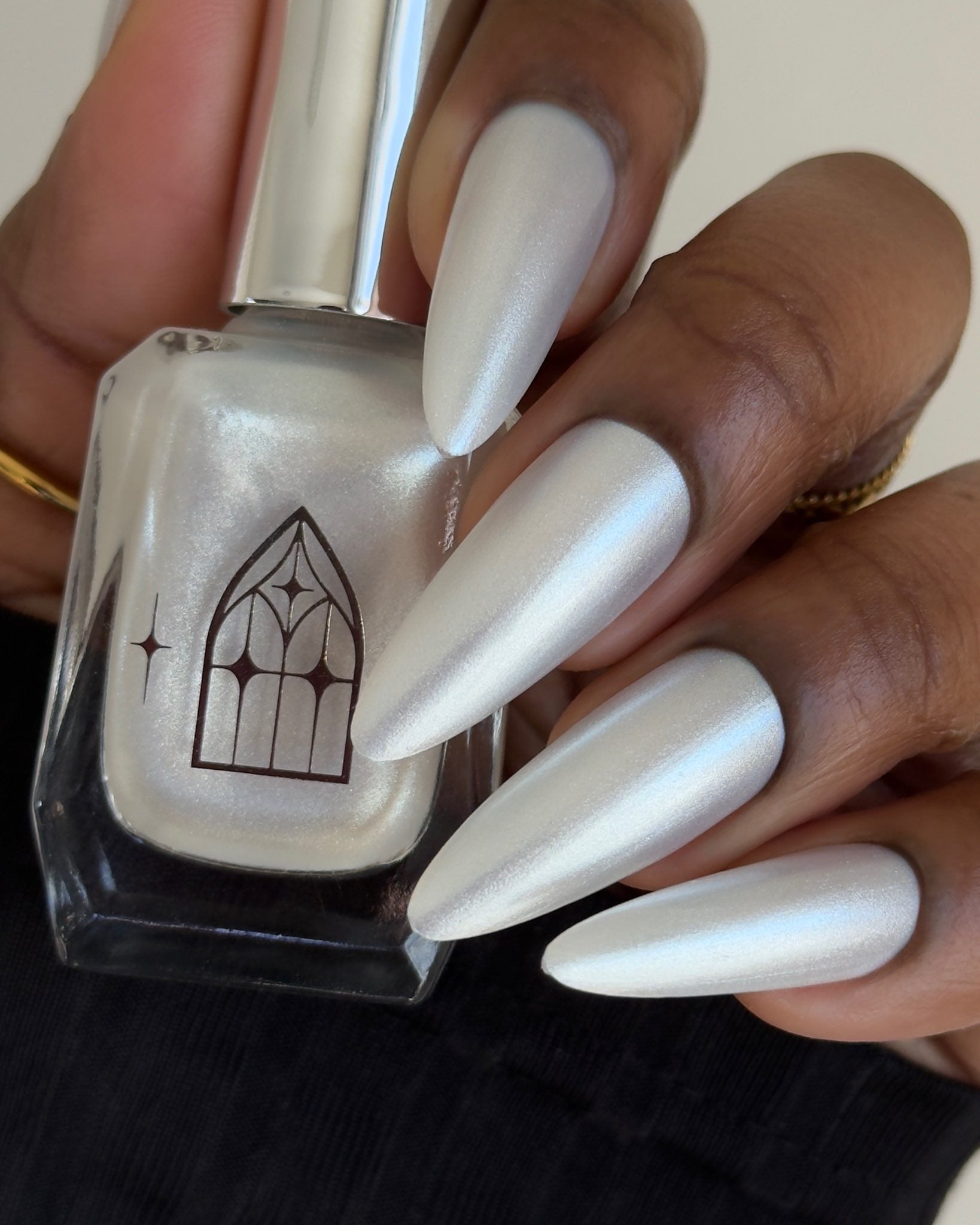 SPIDER GLASS is a white pearlescent with a frosty formula. Delicately luminous like ethereal spider webs. It's gossamer gleam revealed in two to three coats.