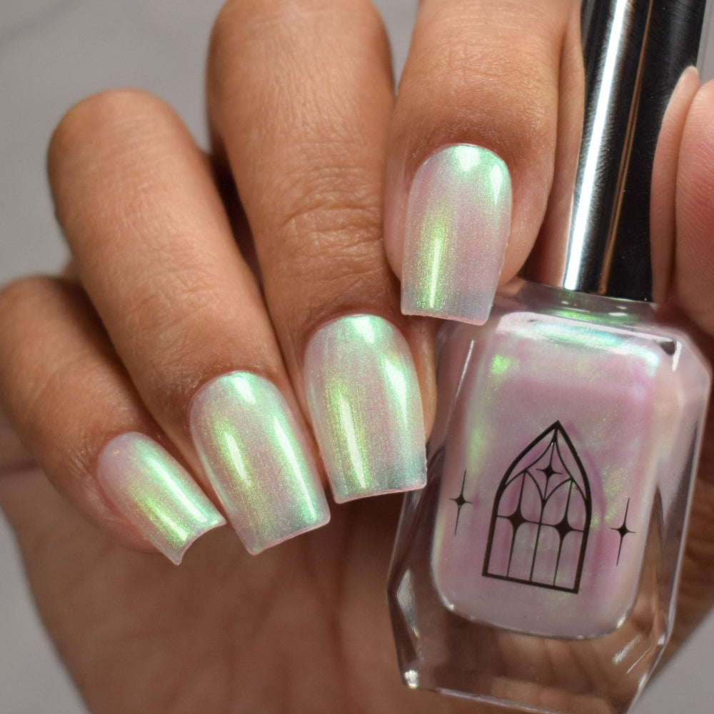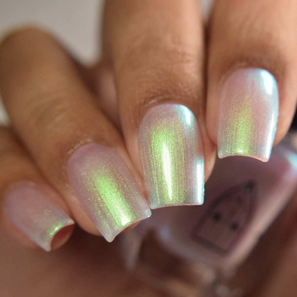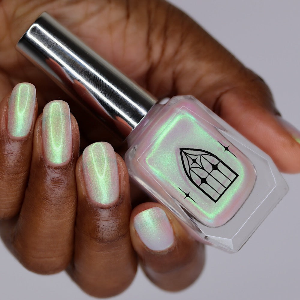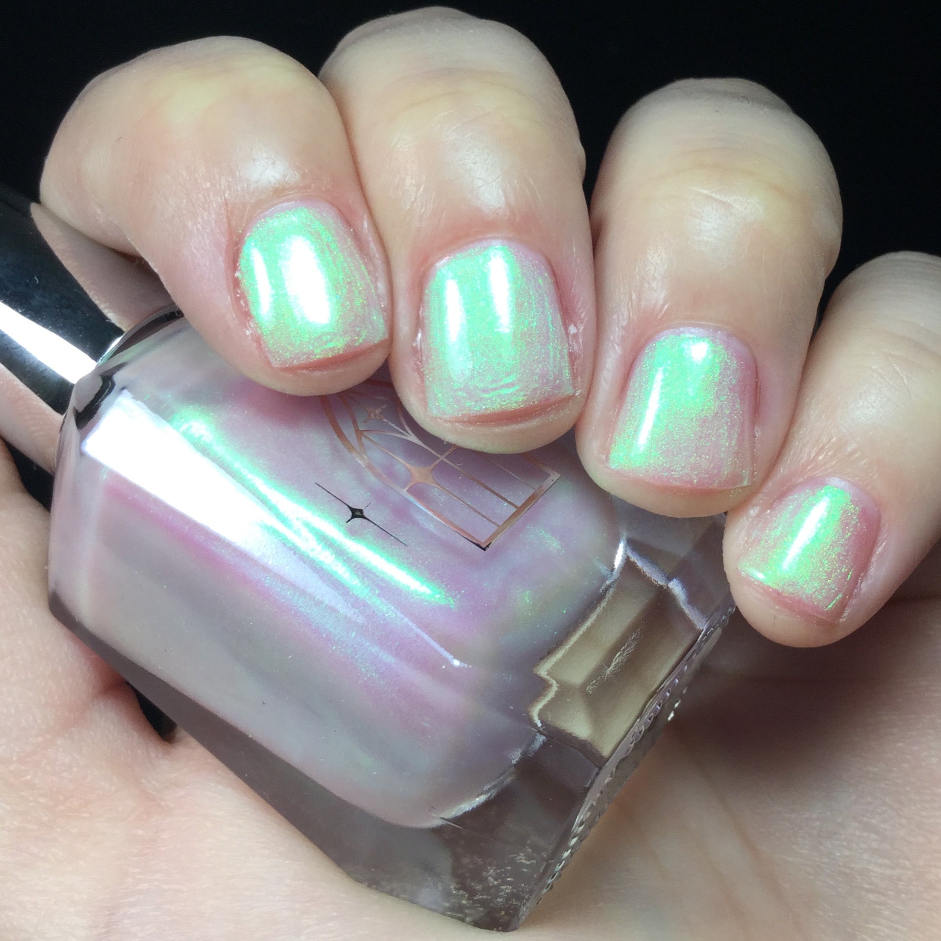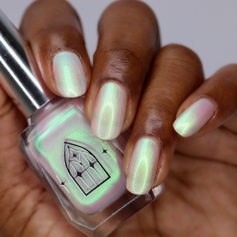 STAR STRAND is a sheer shimmering green to teal shifting polish. Like the cool glimmer of starlight caught on spider's silk. Watch it's astral glow appear in two to three coats.