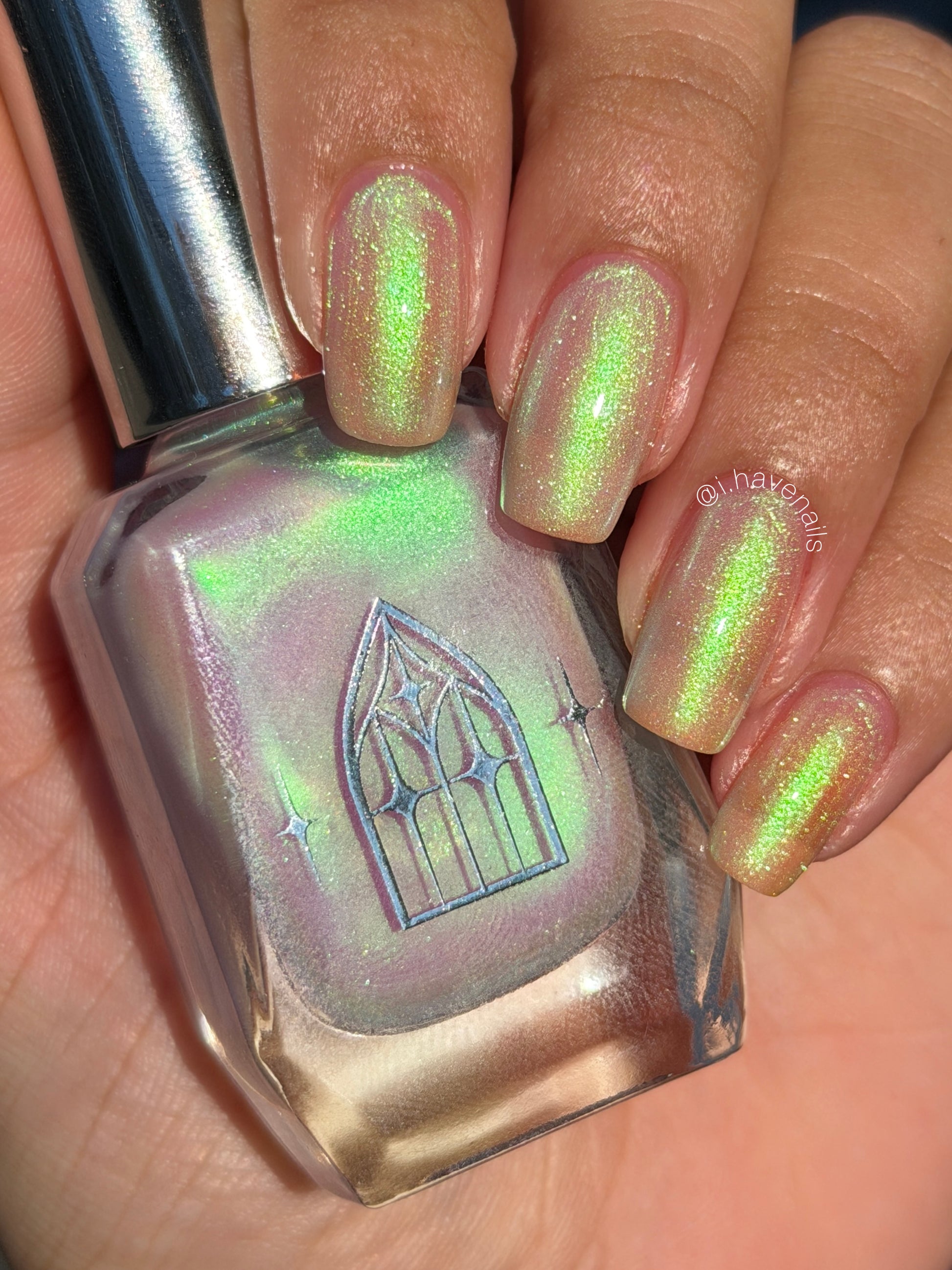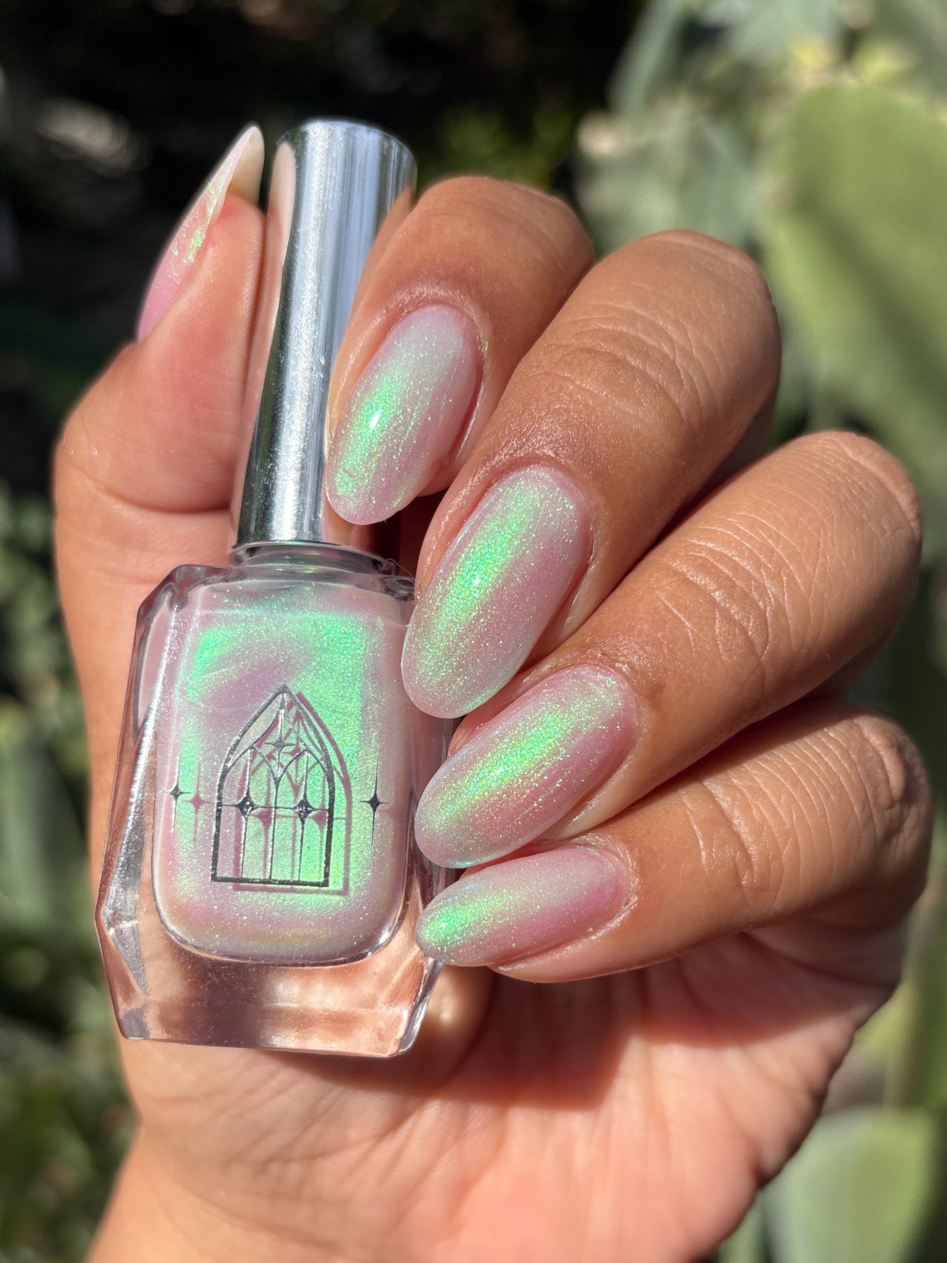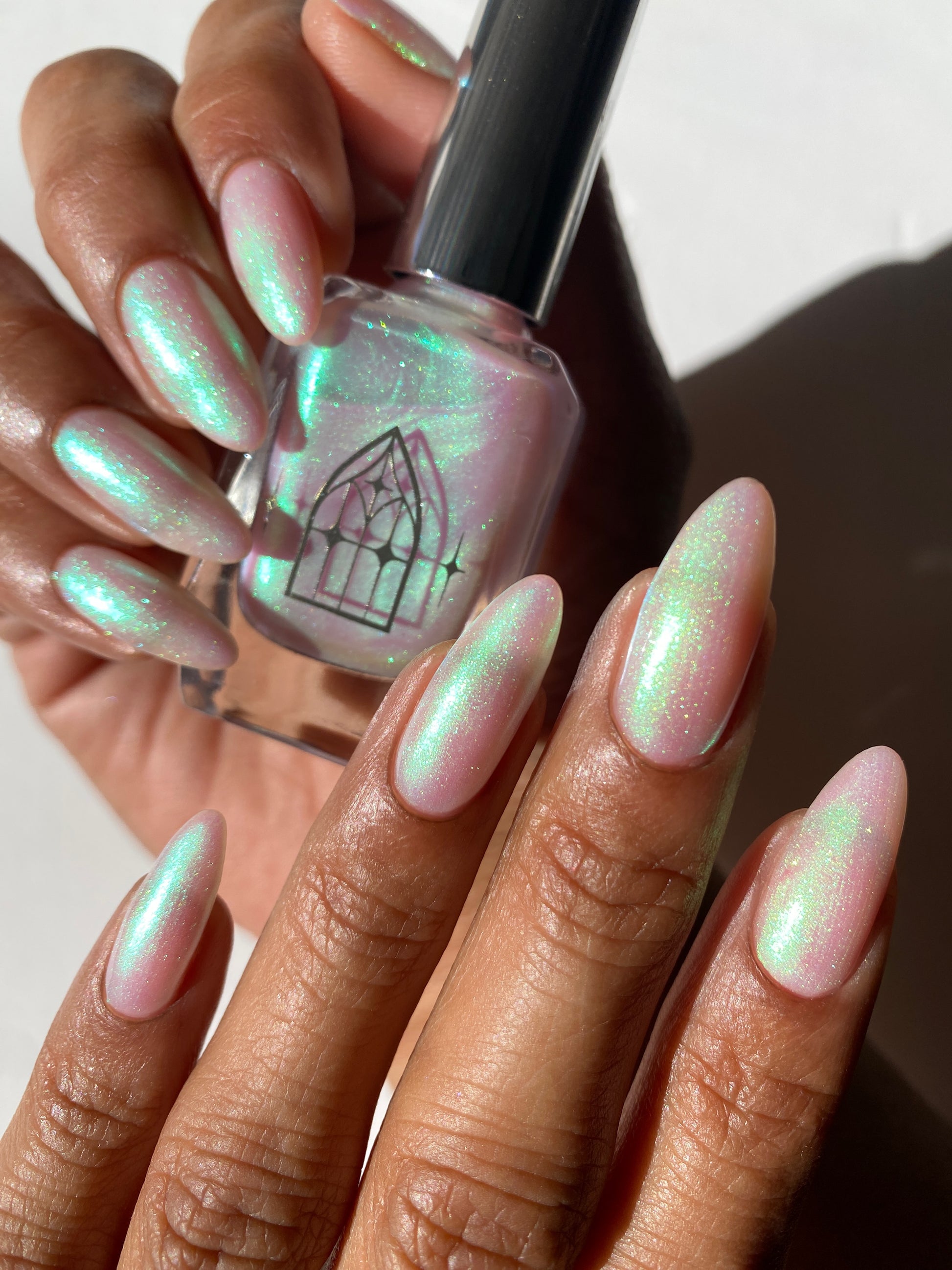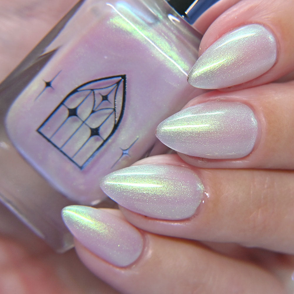 STAR STRAND is a sheer shimmering green to teal shifting polish. Like the cool glimmer of starlight caught on spider's silk. Watch it's astral glow appear in two to three coats.