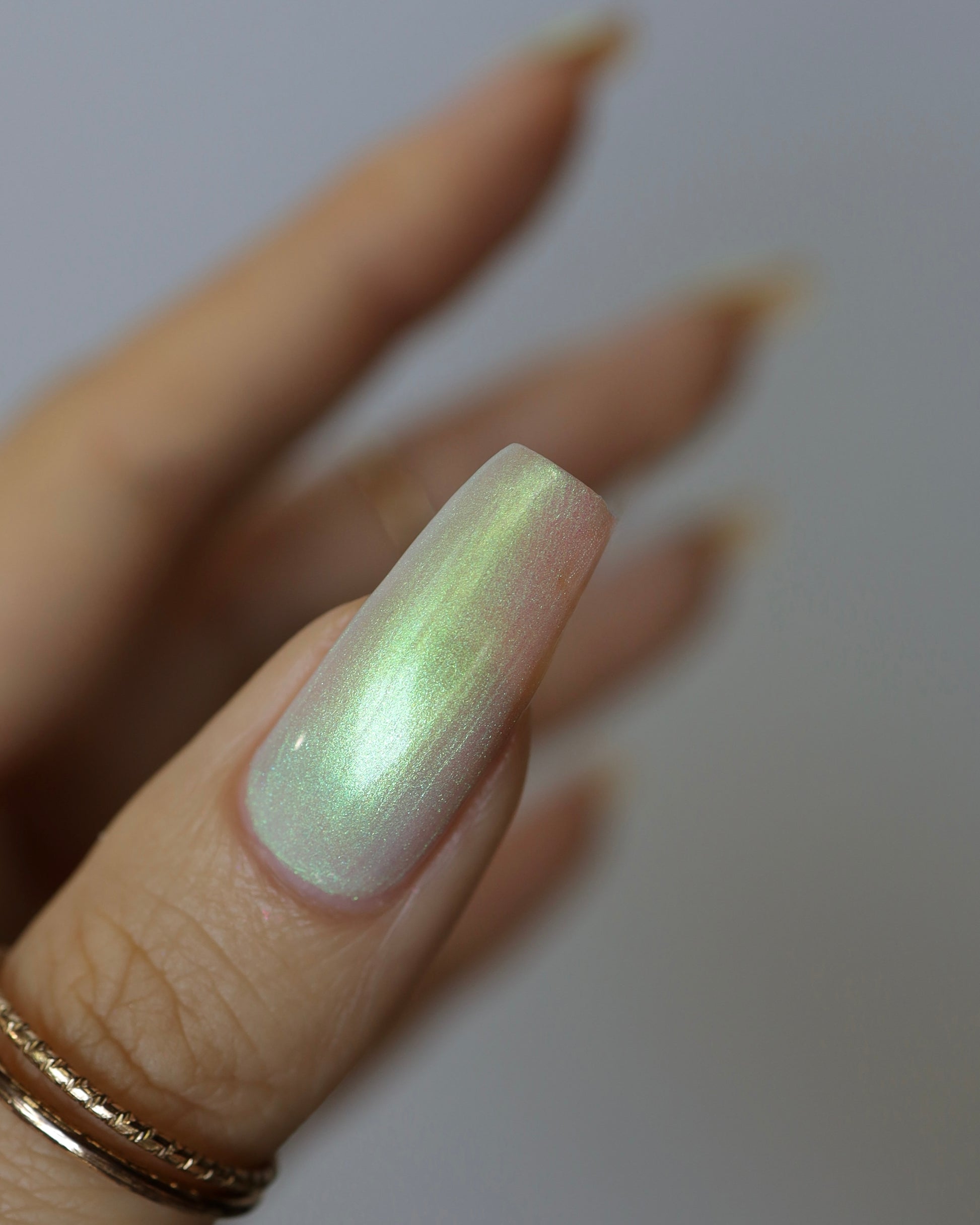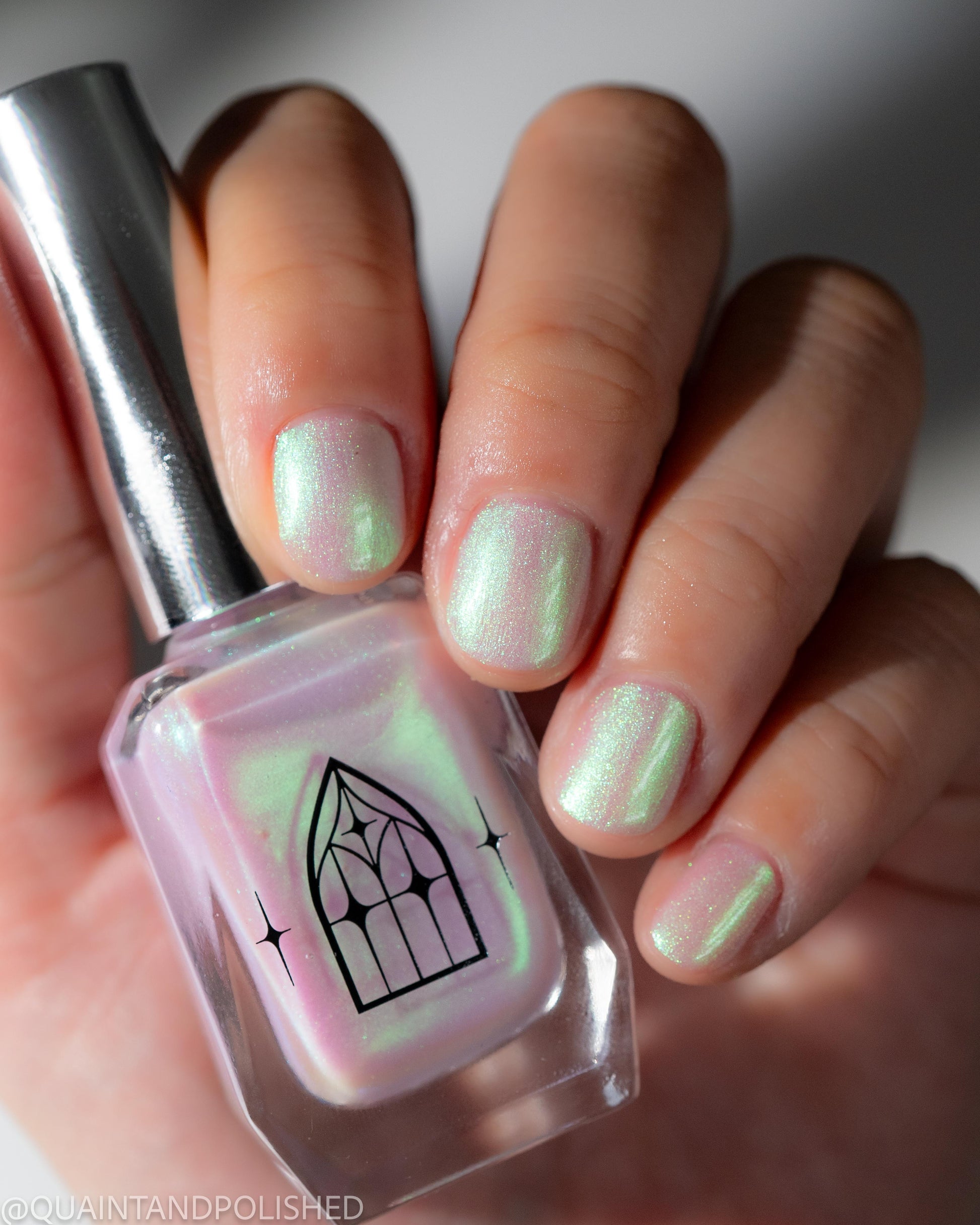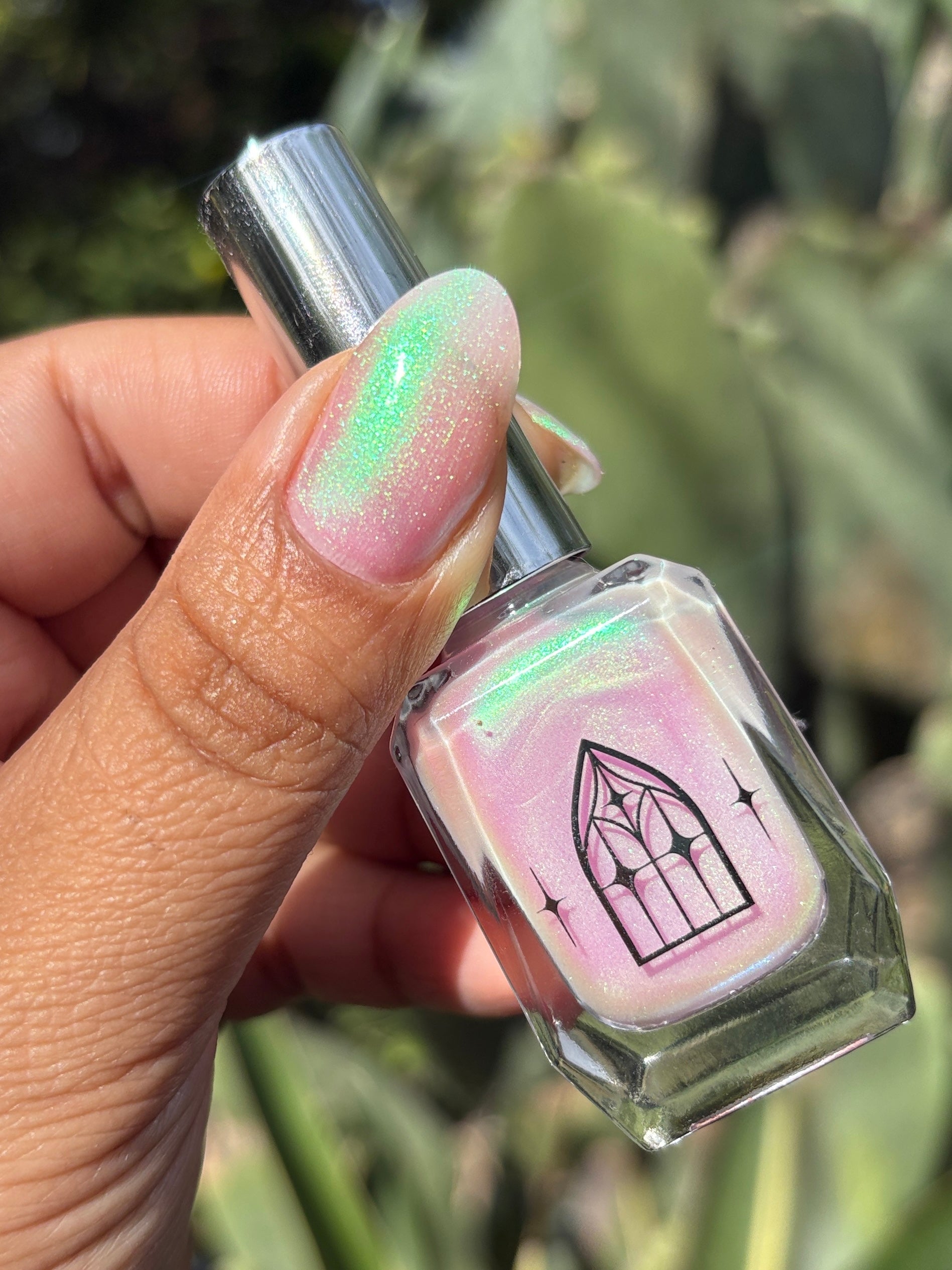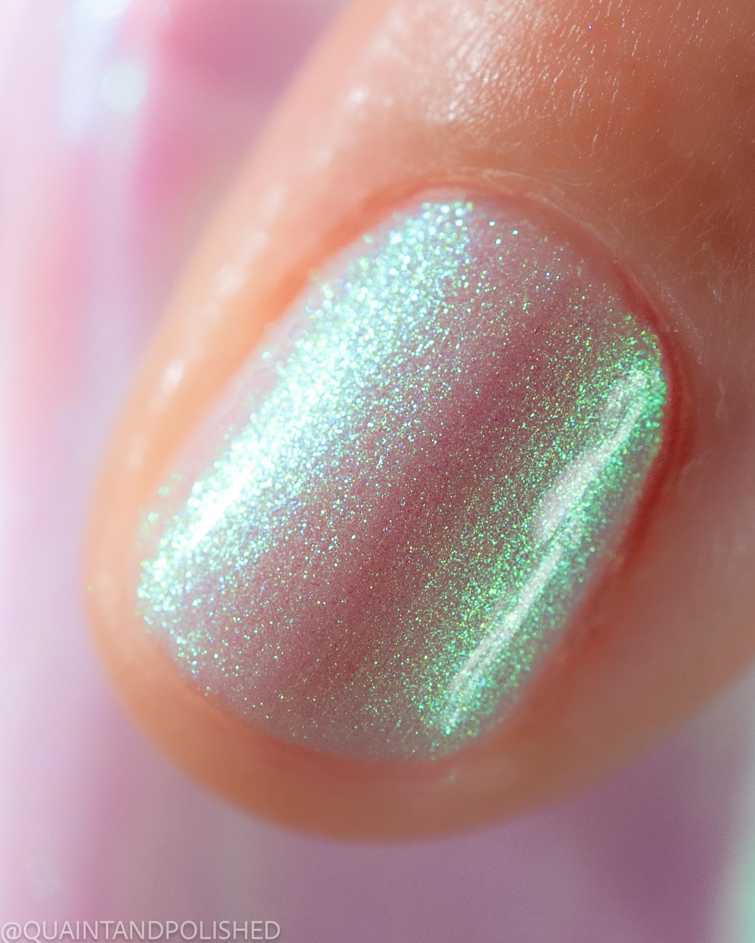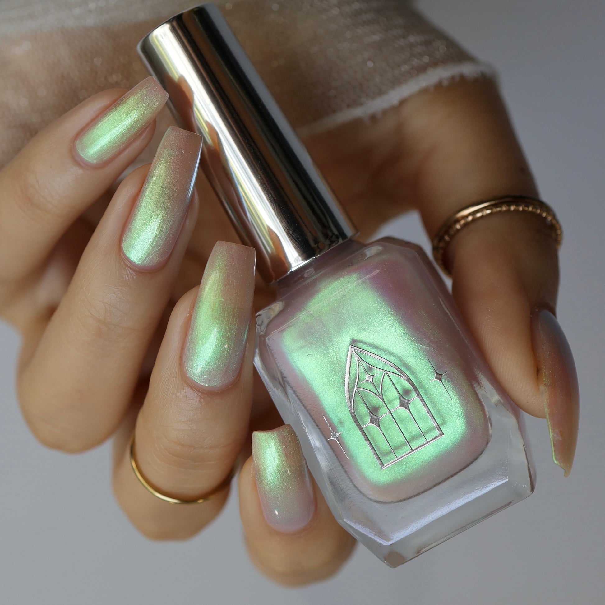 STAR STRAND is a sheer shimmering green to teal shifting polish. Like the cool glimmer of starlight caught on spider's silk. Watch it's astral glow appear in two to three coats.