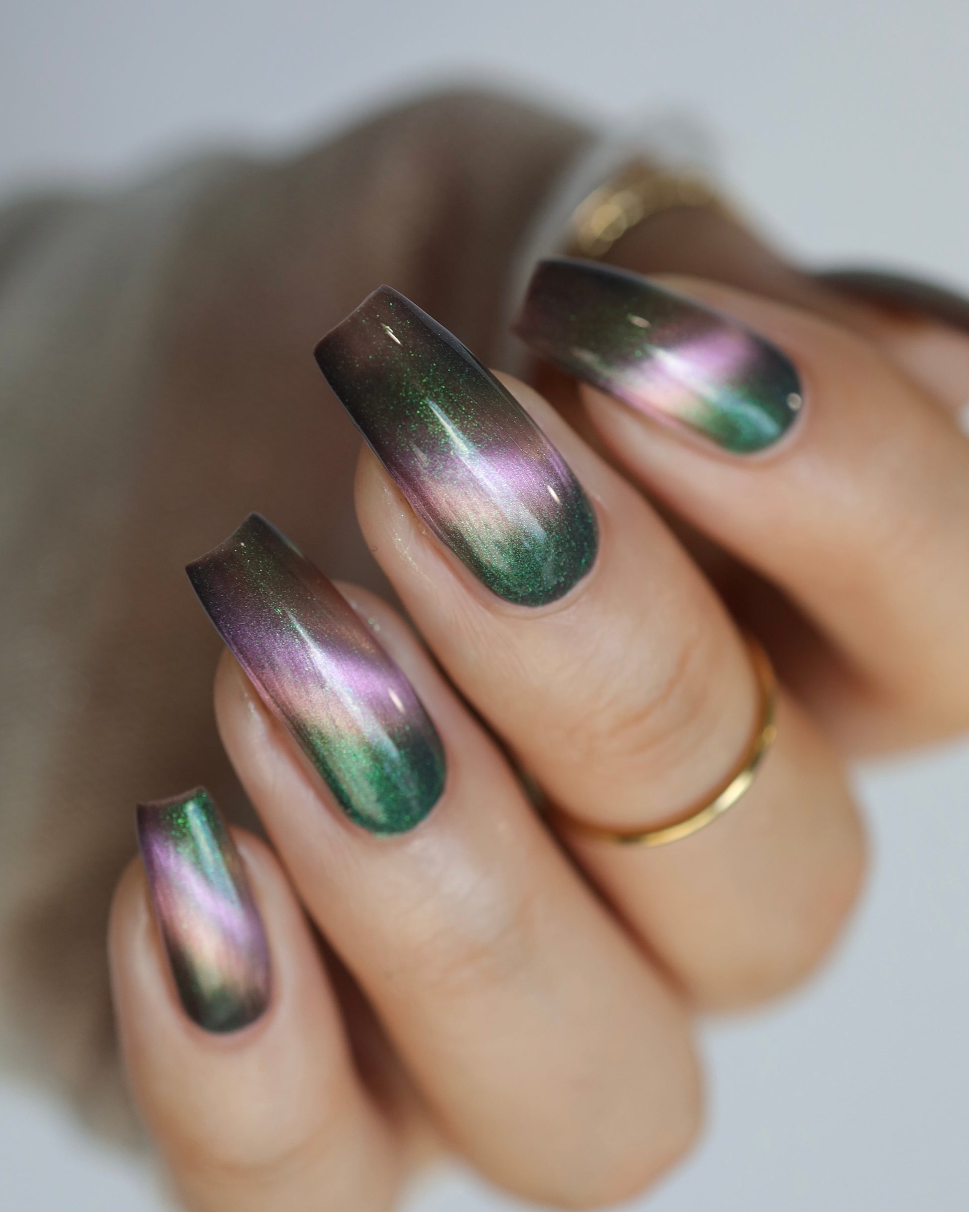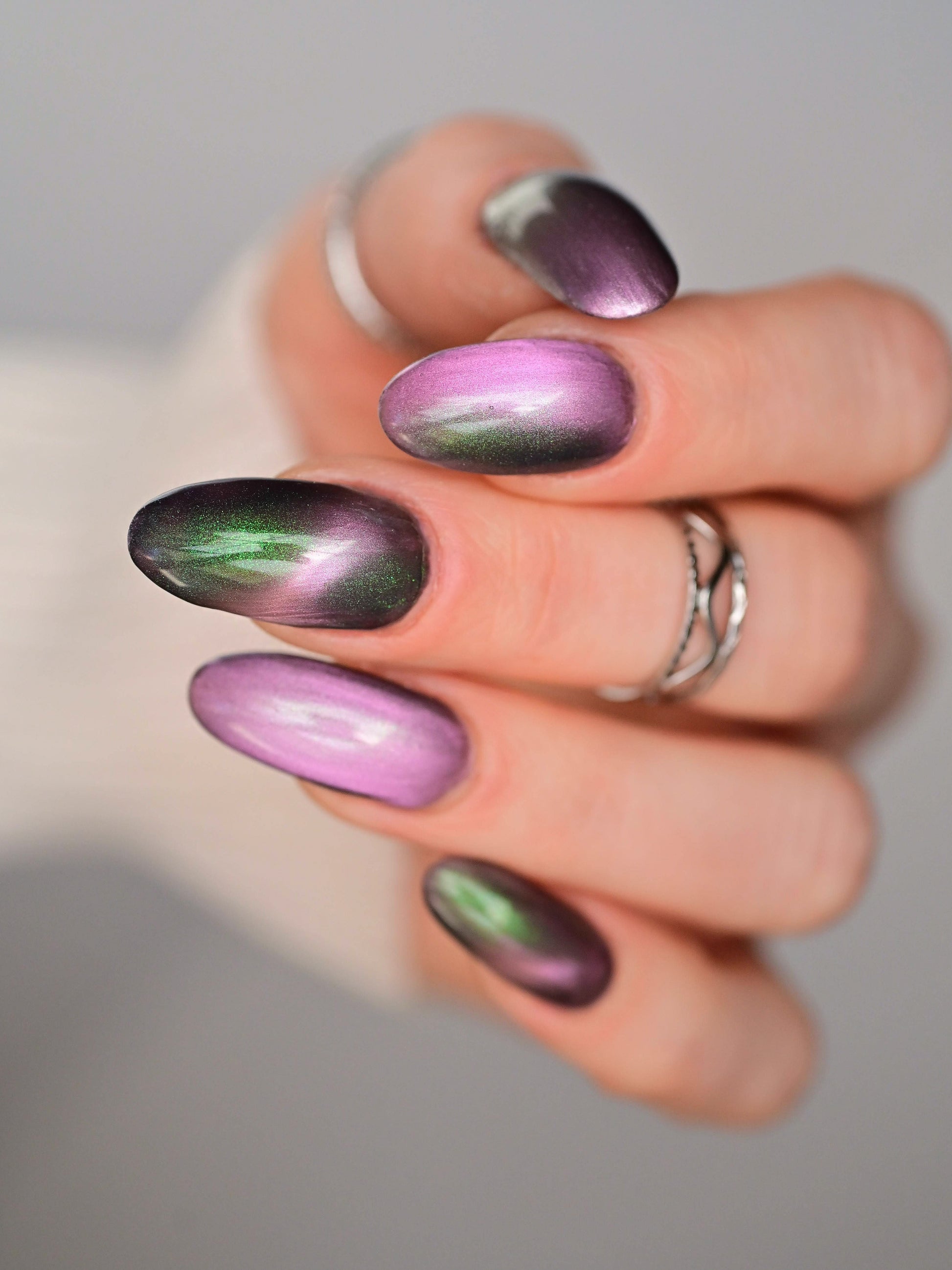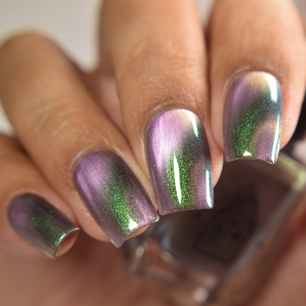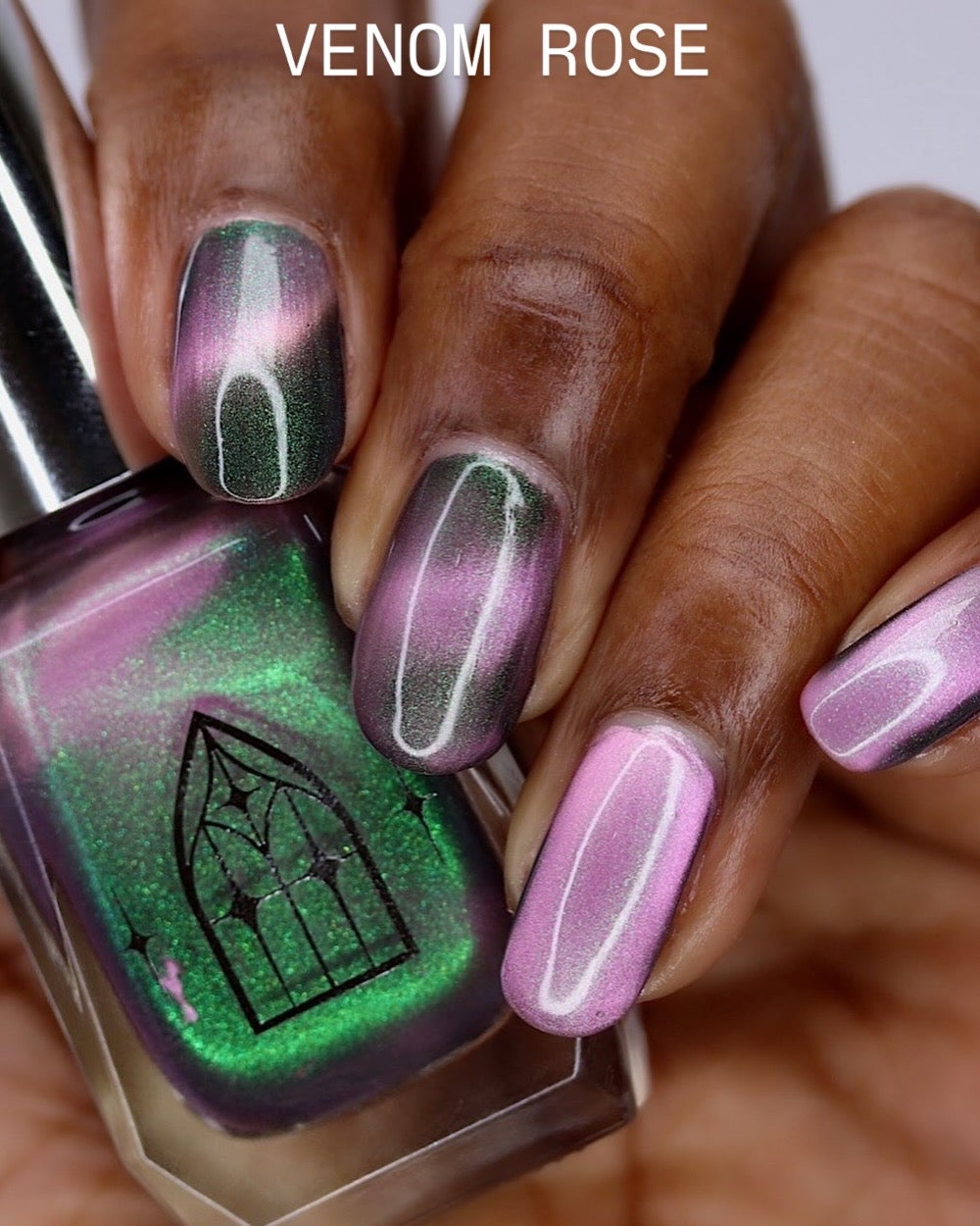 VENOM ROSE is a deep smoke grey with purple undertones, with a soft pink magnetic effect and green shimmer. Like a forbidden rose blossoming in the shadows. It's allure blossoms in two coats.