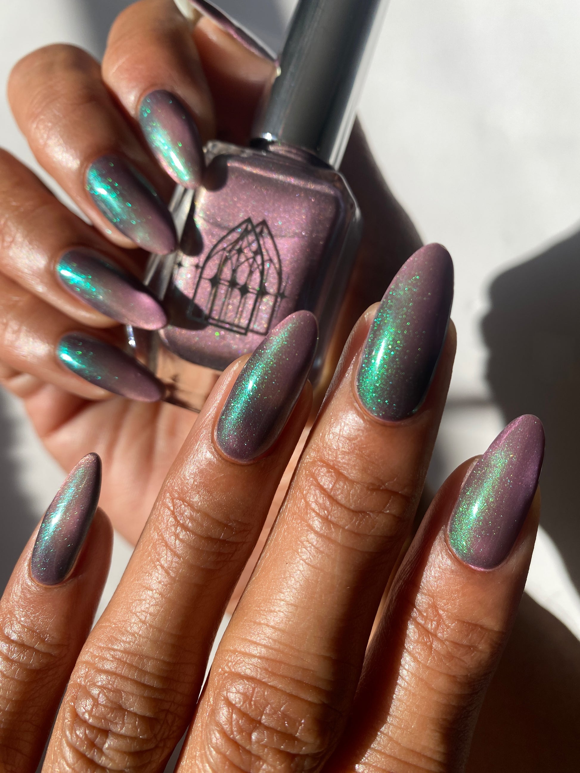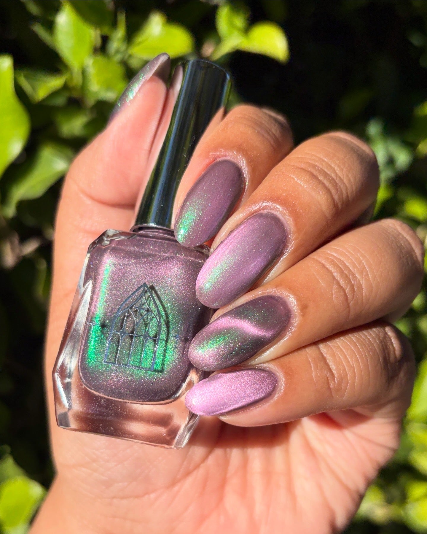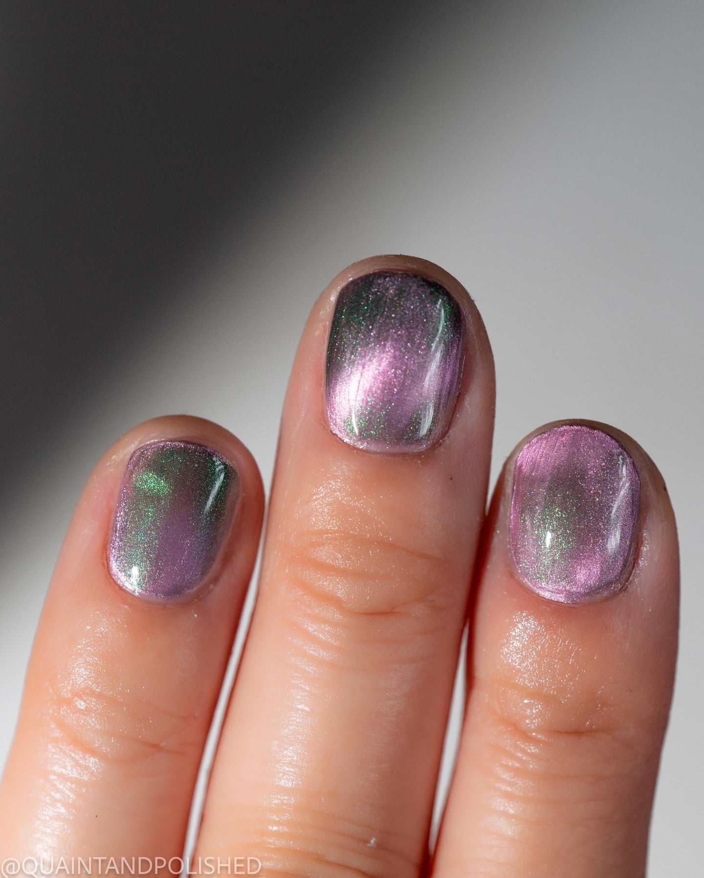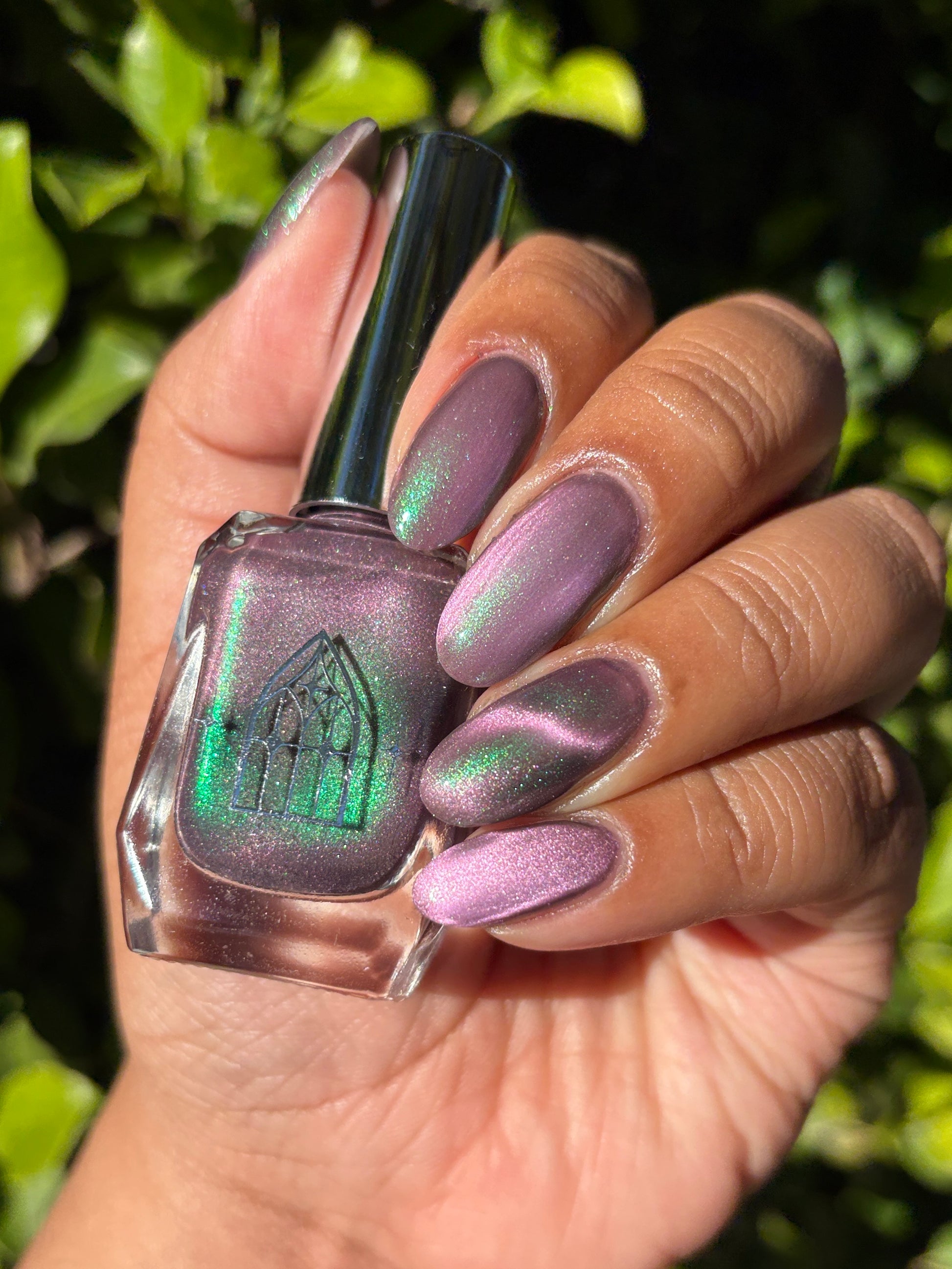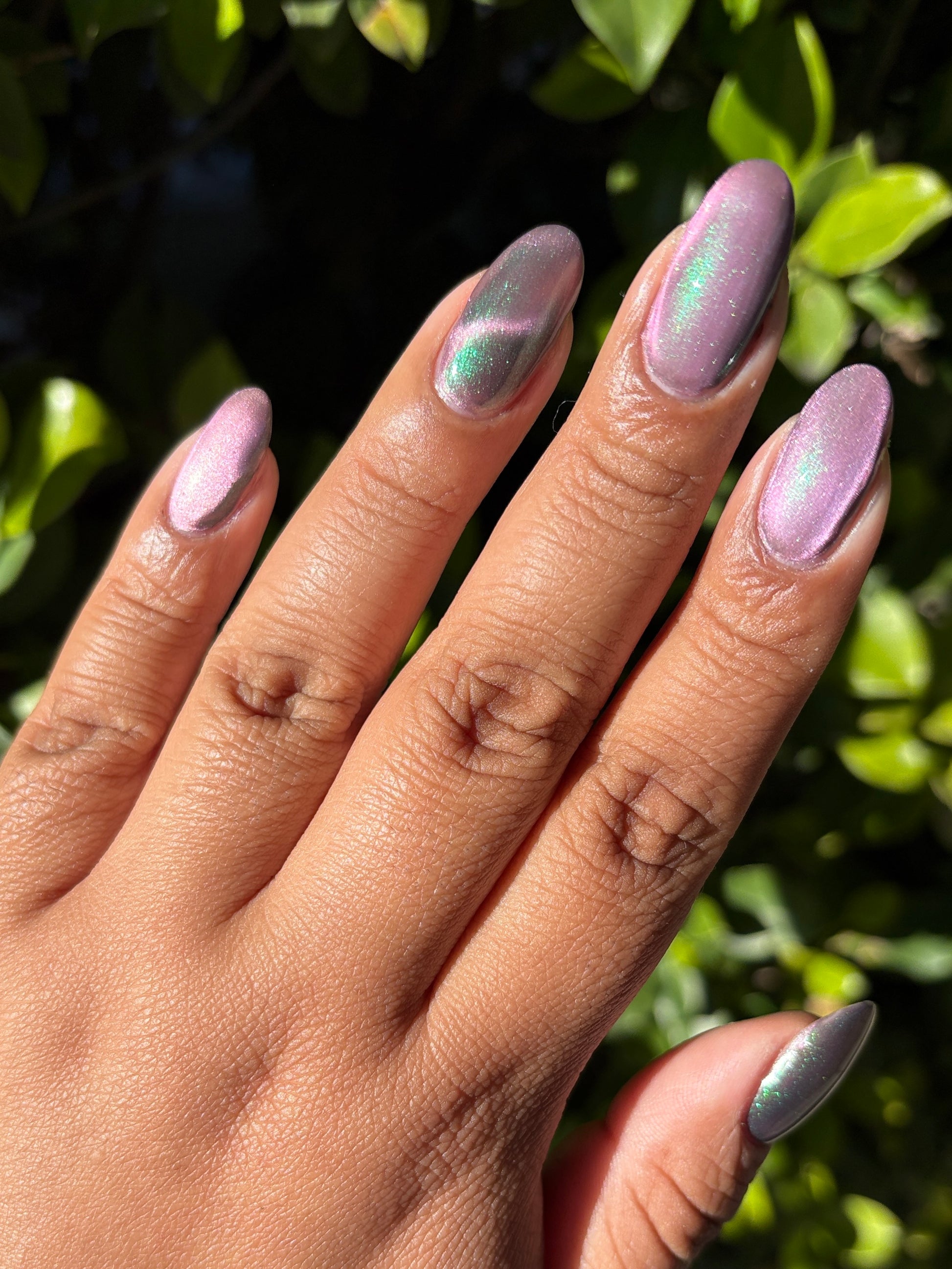 VENOM ROSE is a deep smoke grey with purple undertones, with a soft pink magnetic effect and green shimmer. Like a forbidden rose blossoming in the shadows. It's allure blossoms in two coats.