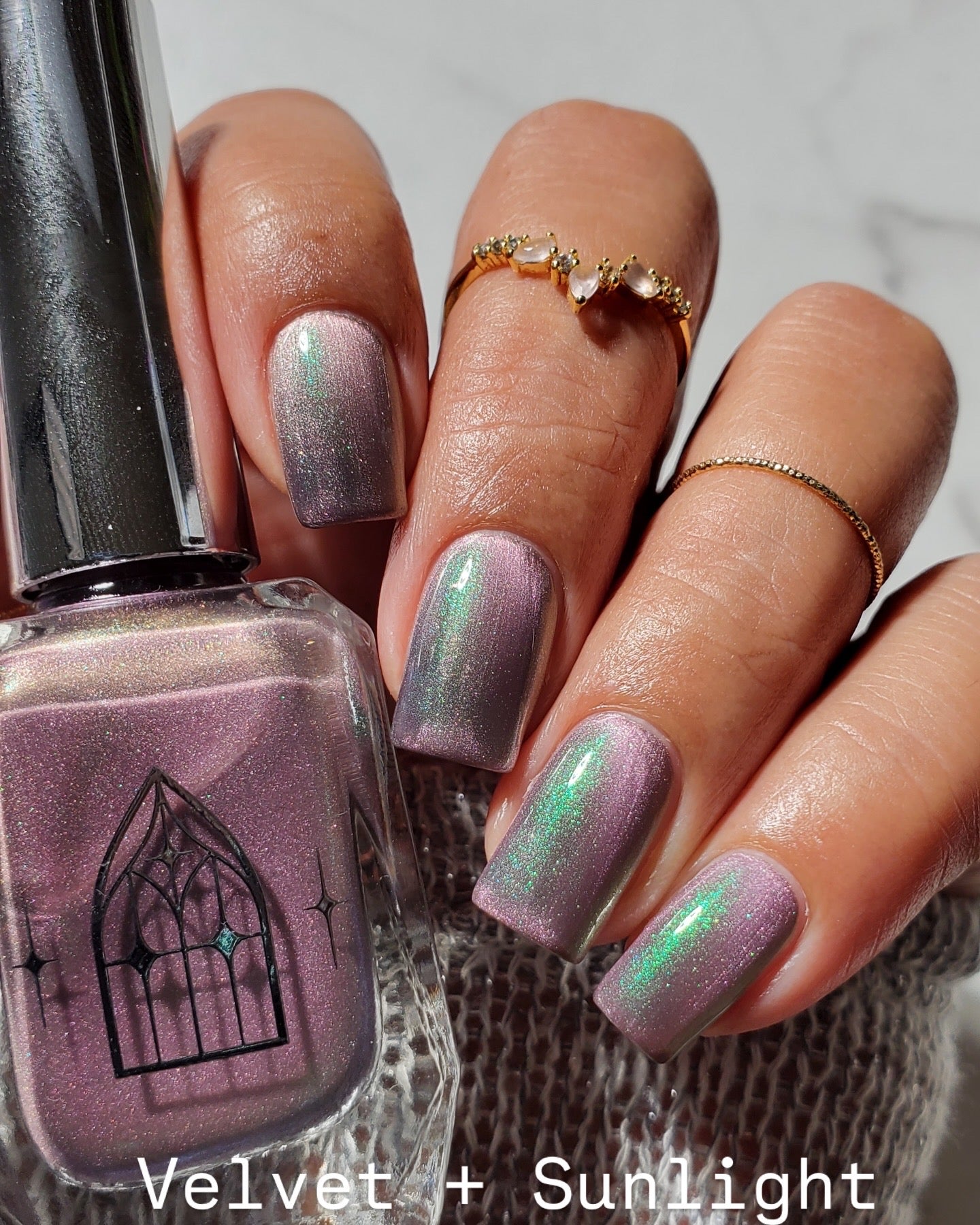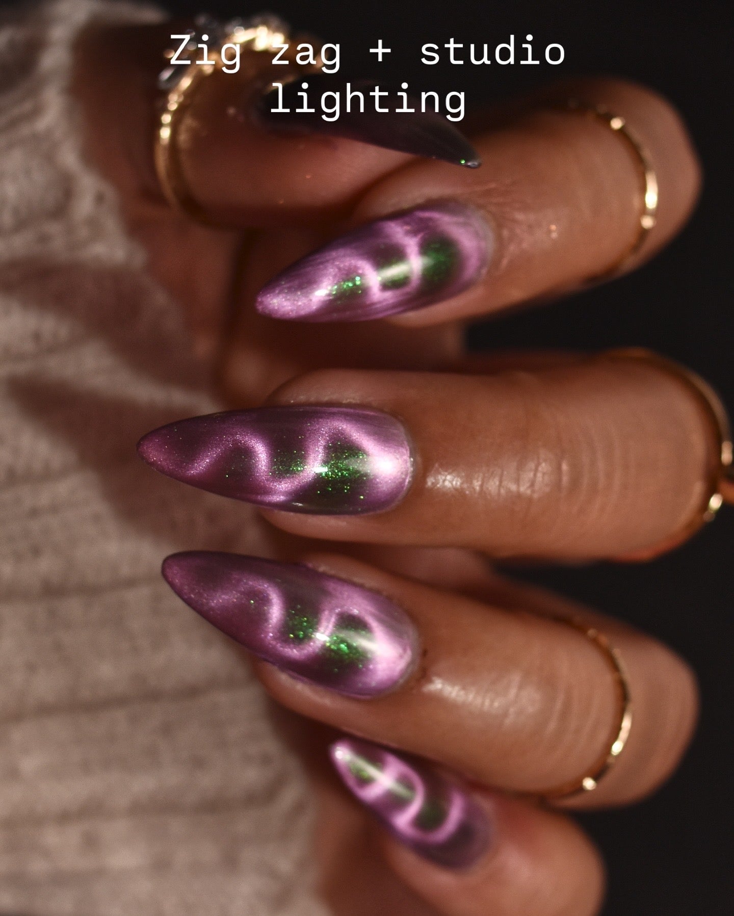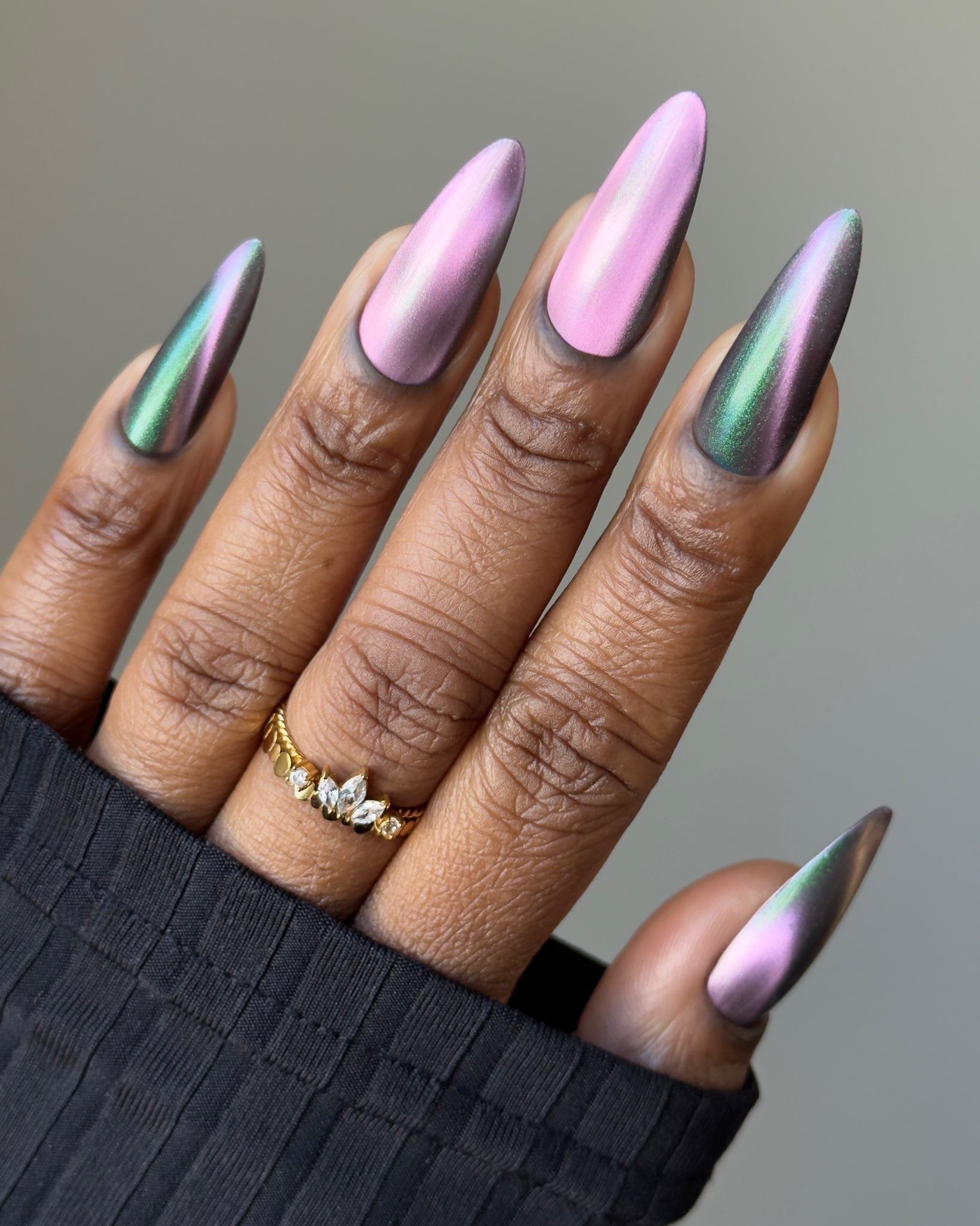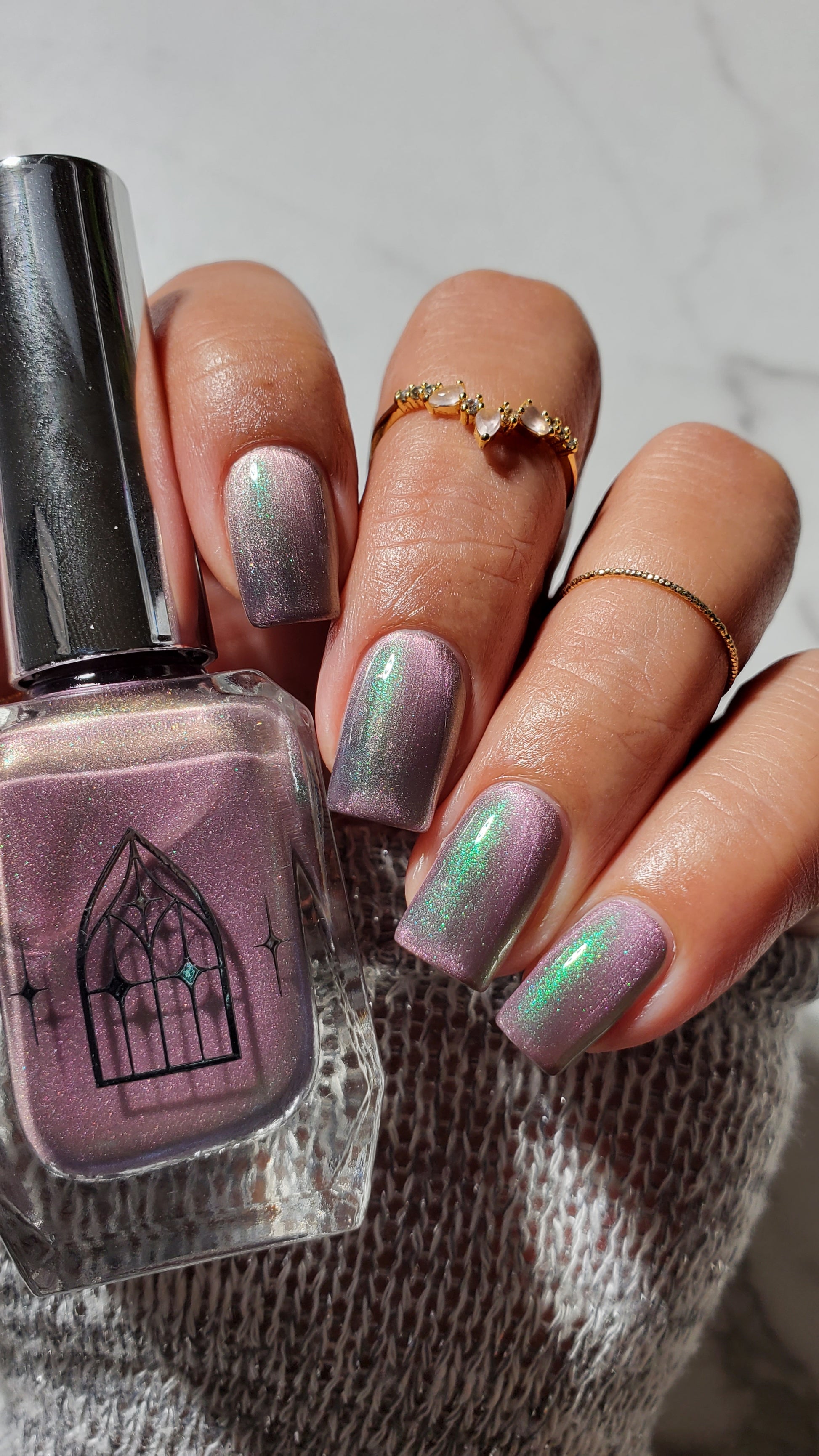 VENOM ROSE is a deep smoke grey with purple undertones, with a soft pink magnetic effect and green shimmer. Like a forbidden rose blossoming in the shadows. It's allure blossoms in two coats.